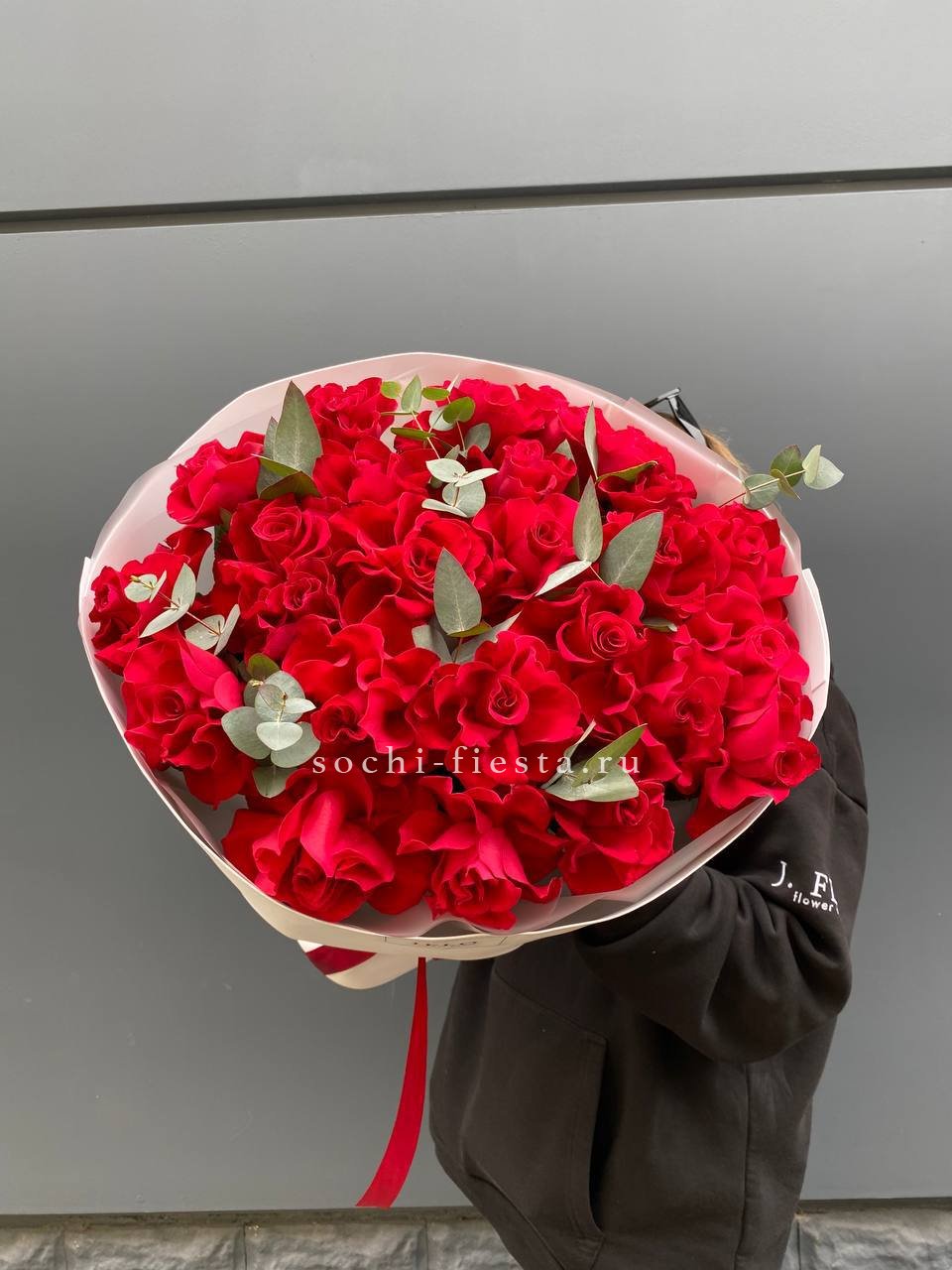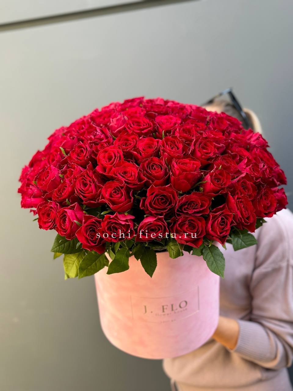 Сто одна кенийская роза в едином цилиндре — это впечатляющий масштаб и безупречная симметрия. Плотный силуэт и насыщенный цвет создают мощное визуальное присутствие. Композиция звучит сама за себя.