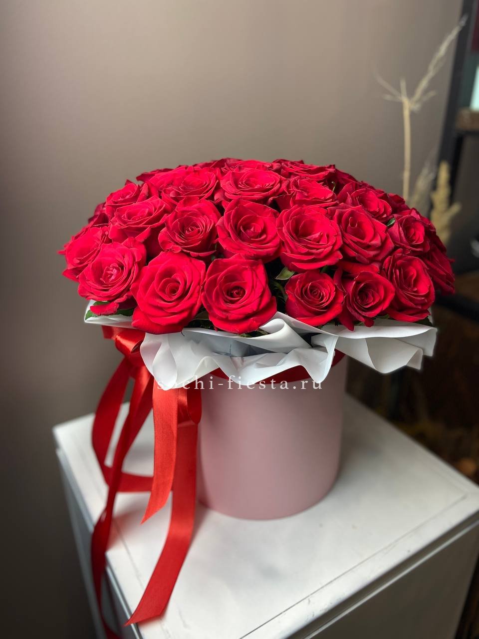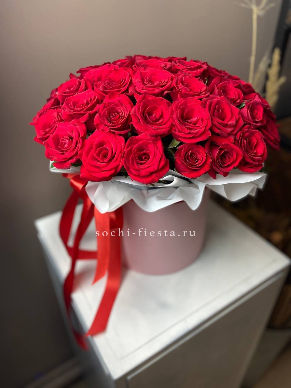 Сто один бутон образует плотную красную сферу с безупречной геометрией. Кенийская роза отличается густотой лепестков и насыщенным оттенком который не теряет глубину даже при ярком свете. Букет держит форму и впечатляет масштабом.