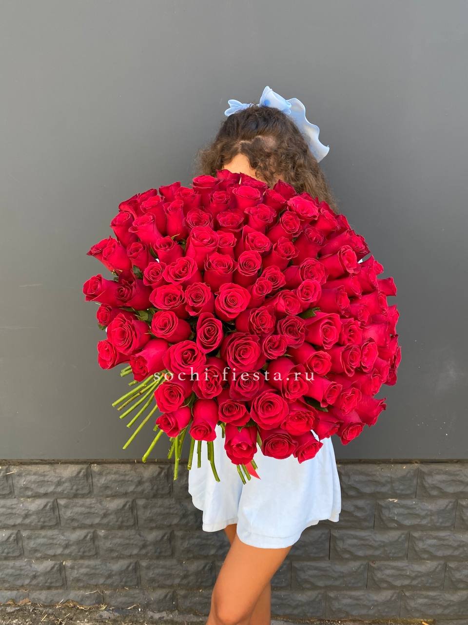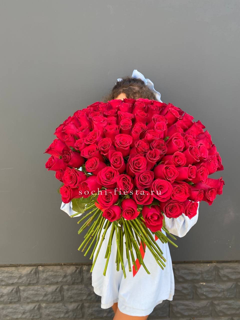 Монобукет из ста одной розы выстроен вертикальными линиями стеблей и плотной шапкой бутонов. Чистый красный цвет без примесей. Формат для по-настоящему значимых событий.