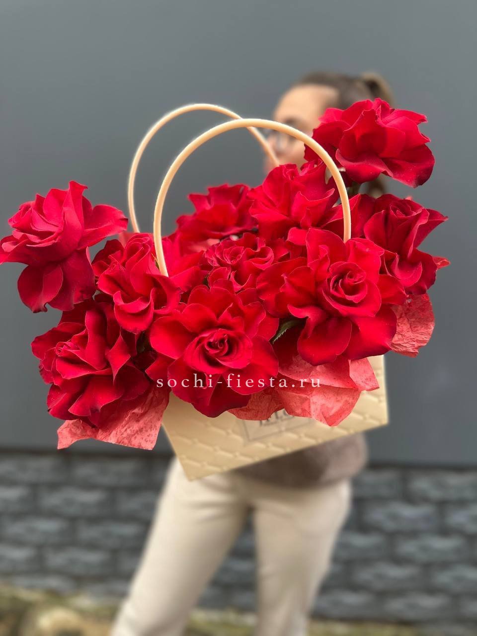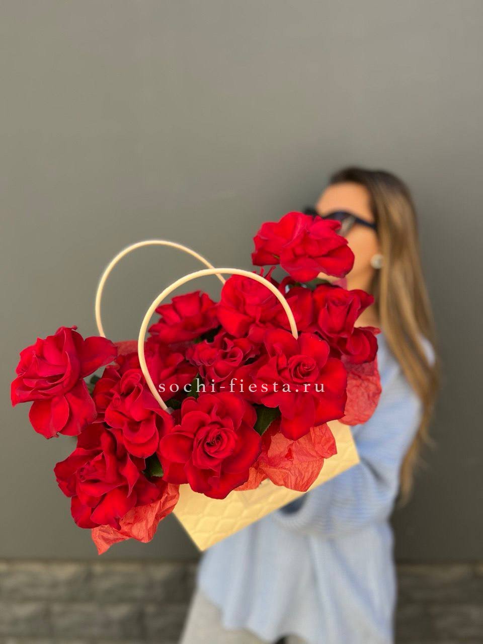 Одиннадцать французских роз выстроены в округлую композицию с веточками эвкалипта. Бутоны крупные и плотные, держат форму и наполняют пространство свежим присутствием.