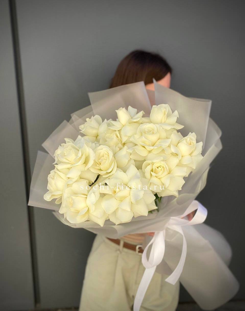 Пышная композиция из одноголовых и кустовых роз в дизайнерской пленке. Эвкалипт добавляет графичности, а лента завершает образ.