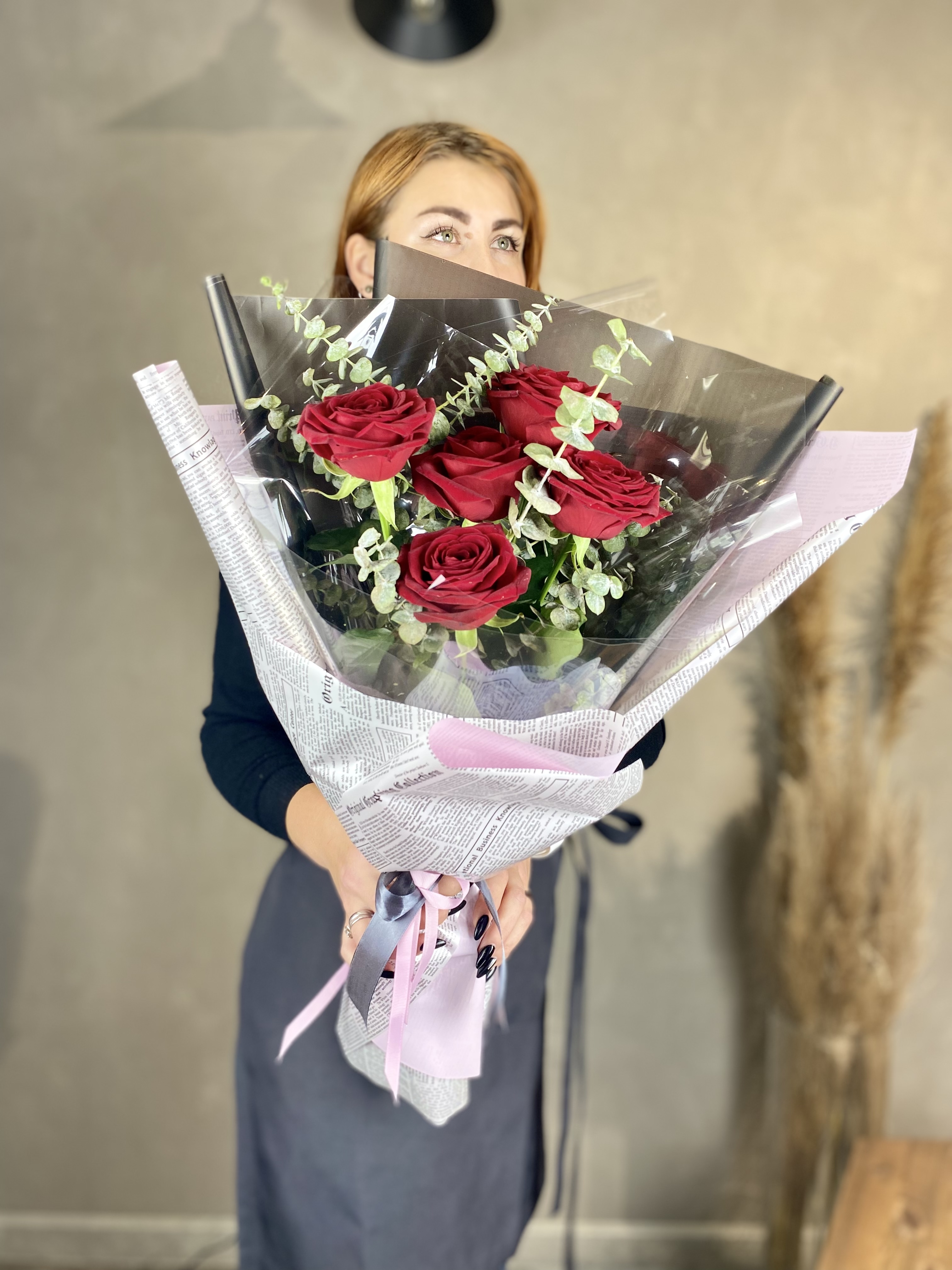 одноголовые розы, розы кустовые, эвкалипт, лента, дизайнерская пленка.