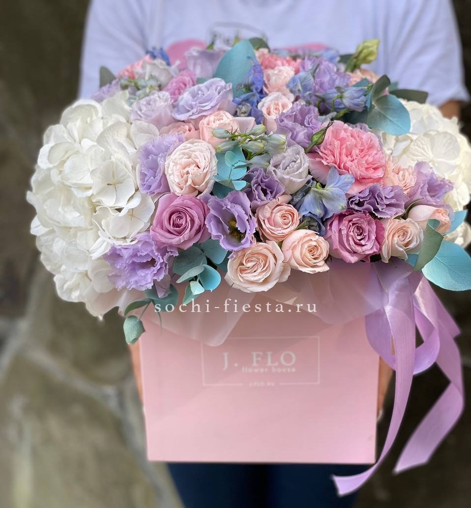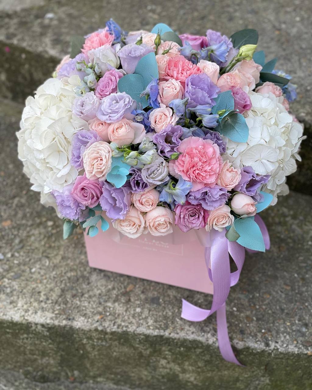 Корзина в лавандовых тонах объединяет пышные соцветия гортензии, кустовые и классические розы с воздушным лимониумом. Эвкалипт добавляет графику и свежесть всей композиции.