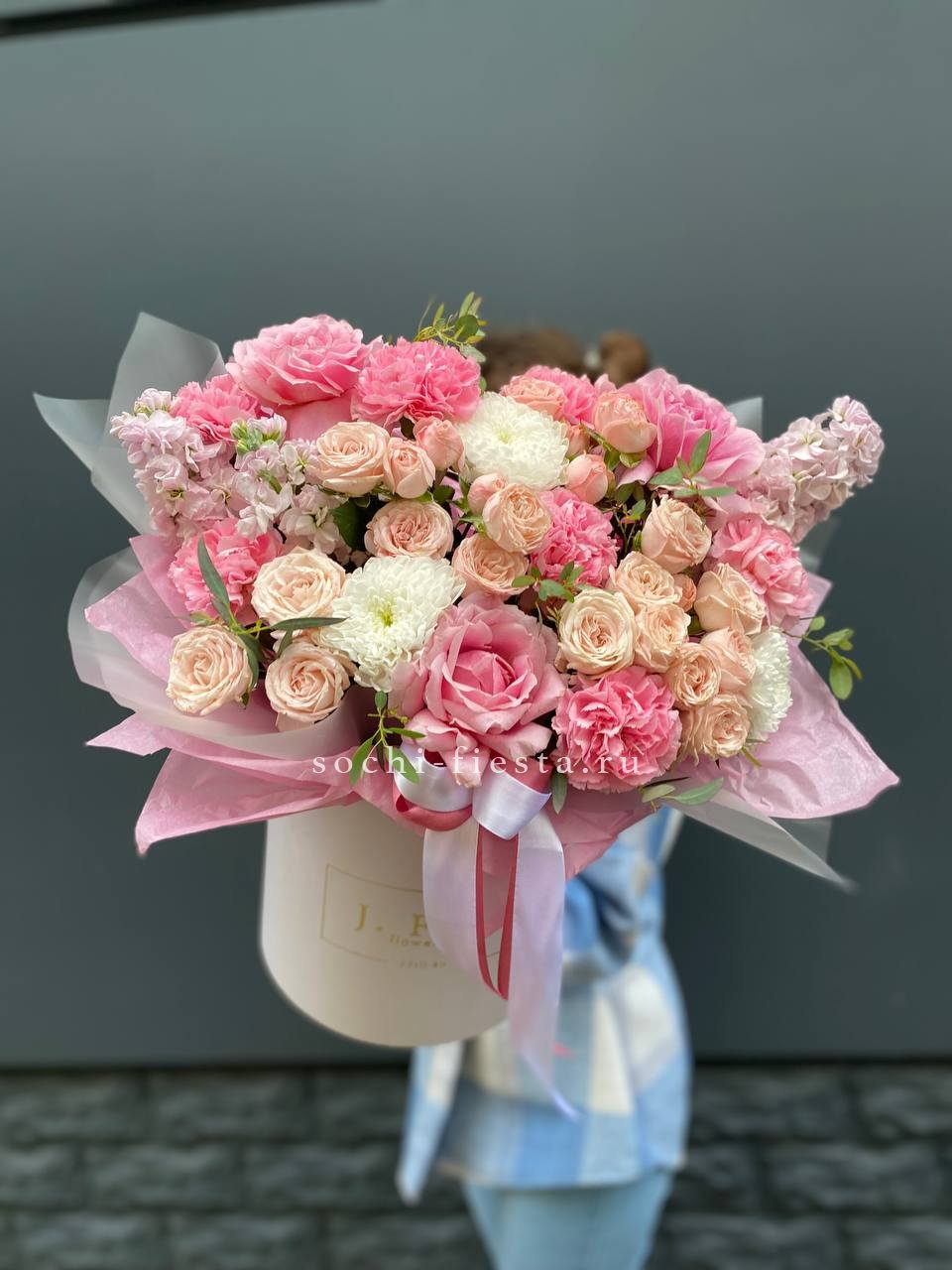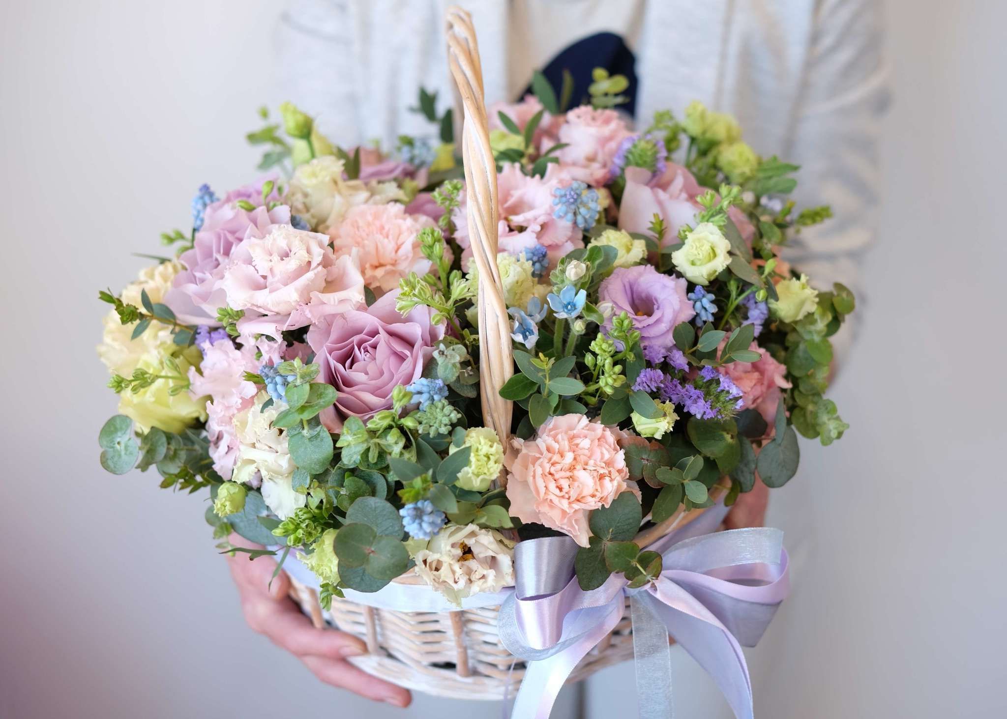 гортензия нежно-розовых оттенков, эустома, львиный зев или маттиола, розовые розы, эвкалипт, вспомогательная зелень, лента, светлая корзин.