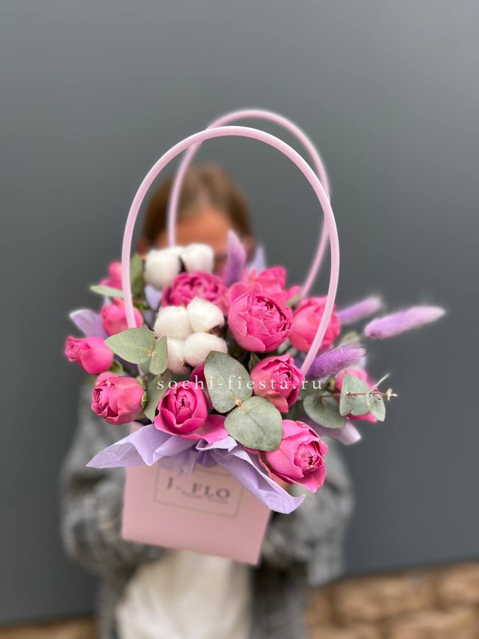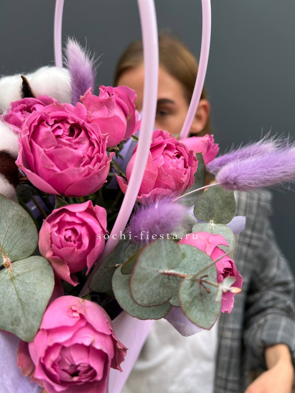 бомбастик, роза, эустома, диантус, эвкалипт, авторская упаковка, лента.
