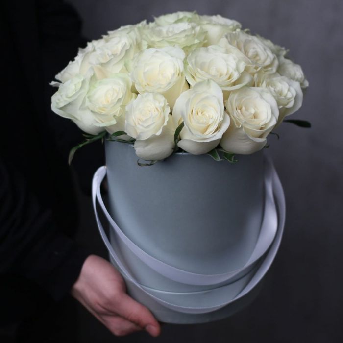 Белые розы встречаются с лиловым диантусом и кремовой эустомой в круглом боксе. Озотамнус и эвкалипт создают фактурный фон для цветочной композиции.