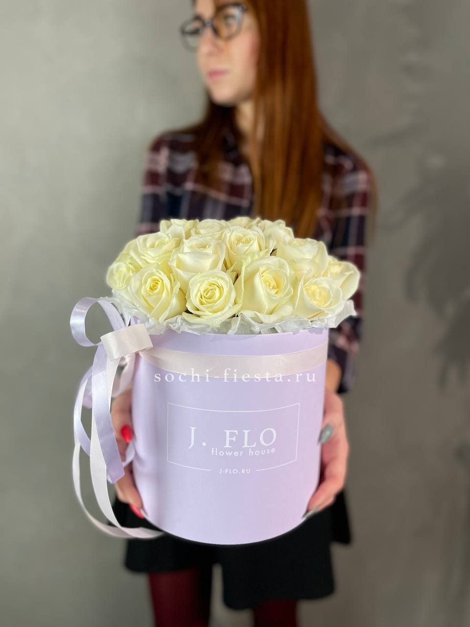 Пионовидные розы раскрываются густыми лепестками, хамелациум добавляет воздушности. Композиция держит форму и долго сохраняет свежесть.