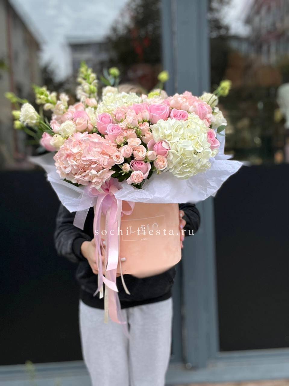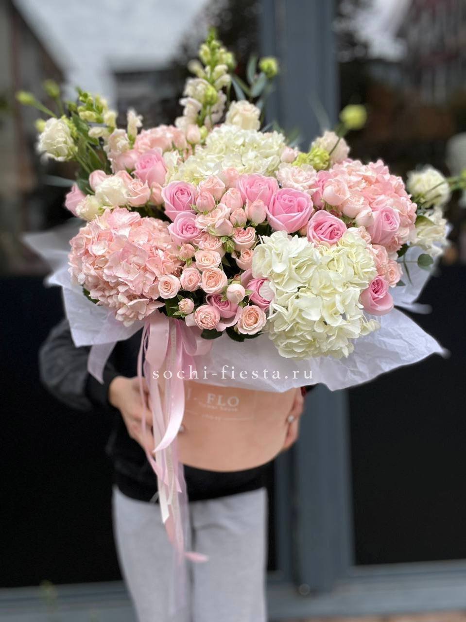 гортензия, розовые пионы Сара Бернар, розы белые, эустома, маттиола (замена вне сезона), эвкалипт, лента, дизайнерская упаковка.