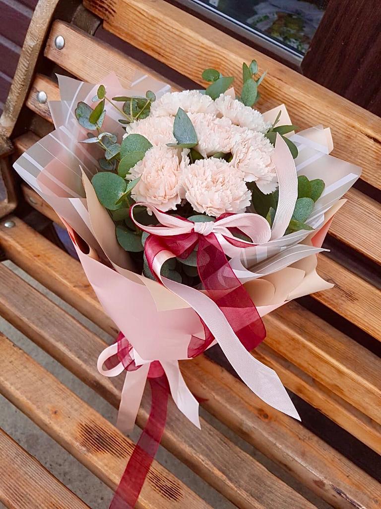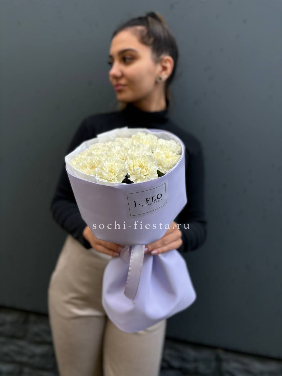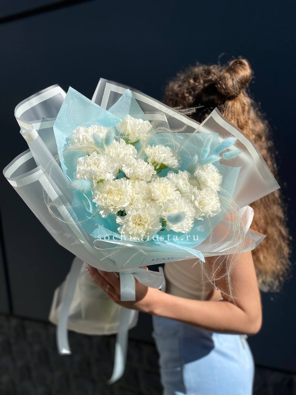 Диантусы с их густыми бутонами и резной формой лепестков выглядят графично и современно. Белый цвет усиливает архитектурность линий и создаёт чёткий визуальный ритм.