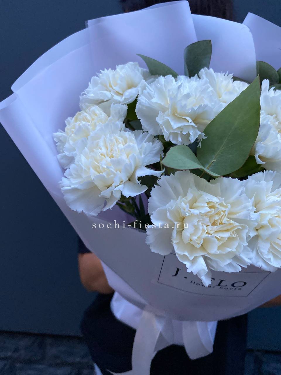 7 кремовых диантусов, эвкалипт, лента, дизайнерская пленка комбинированная.