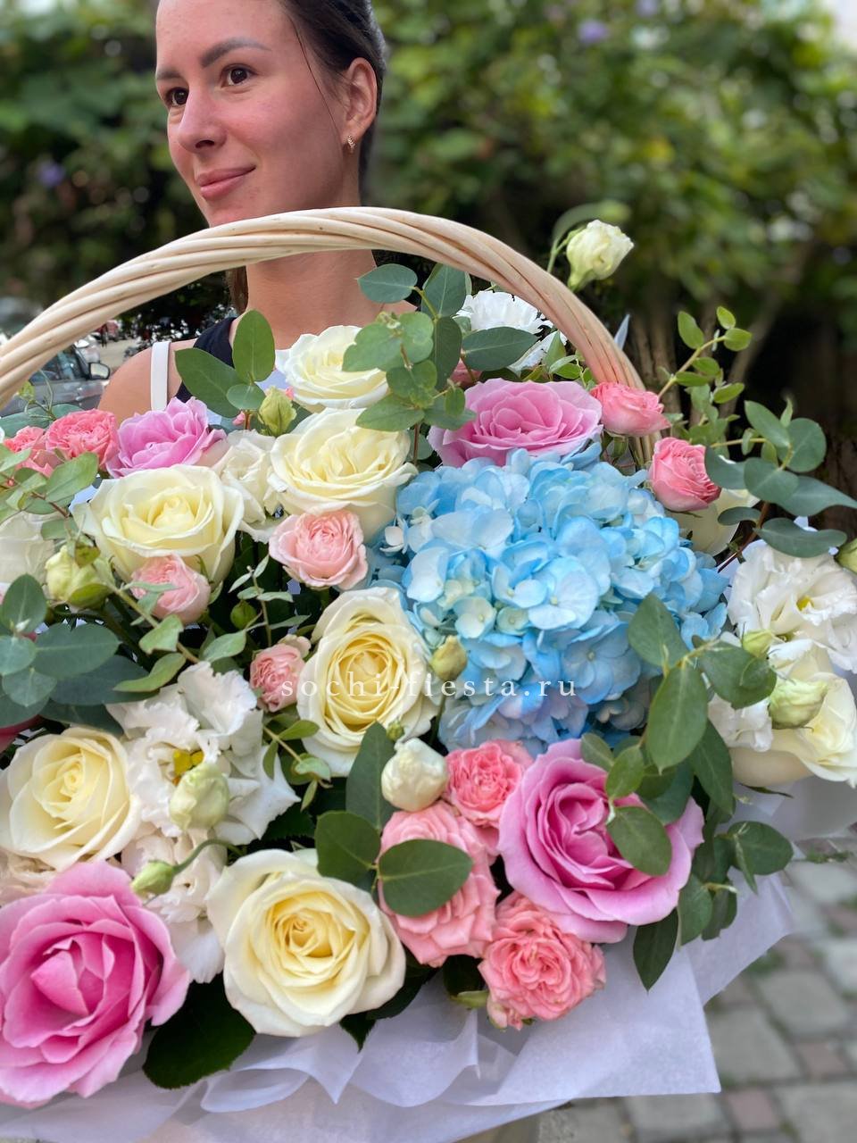 Цветочная корзина из пионов и пионовидных роз "Юниверсити"