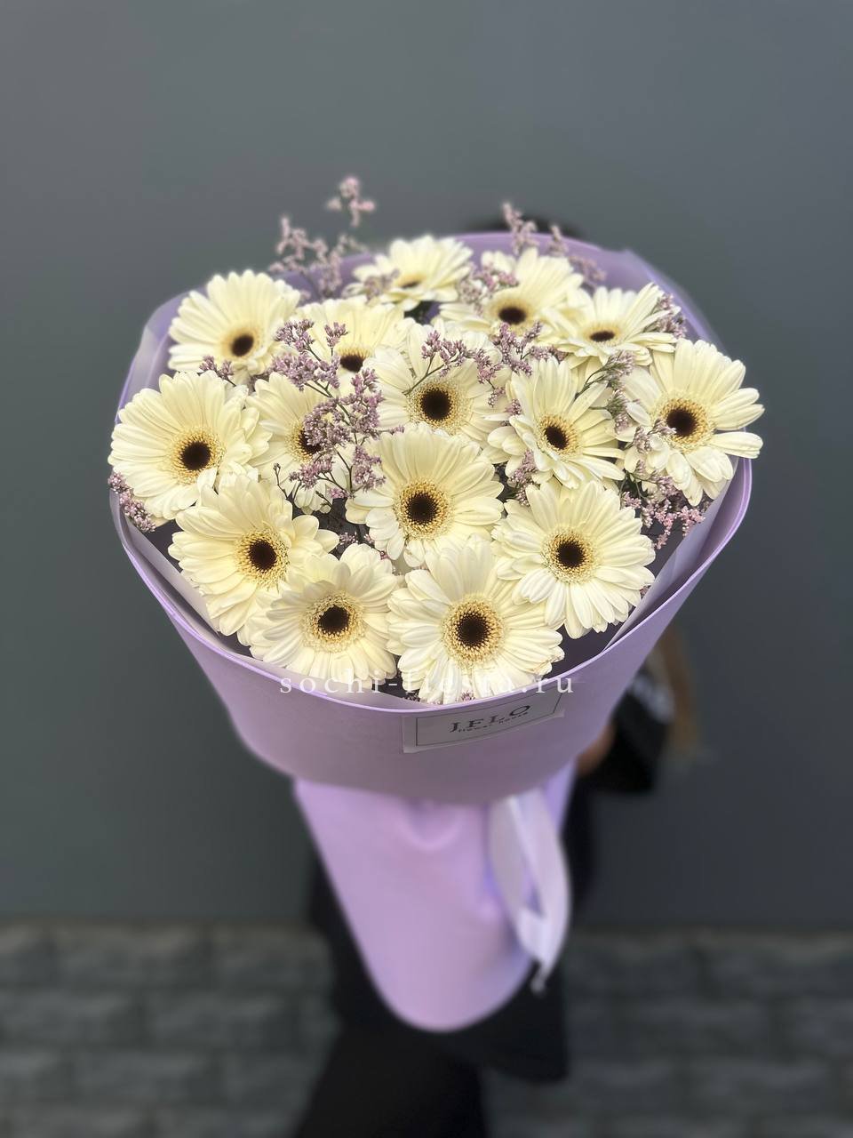 Пятьдесят один бутон под лентой — это объём и яркое присутствие в любом помещении. Герберы выстроены плотно, образуя впечатляющую композицию. Такой букет сложно не заметить.