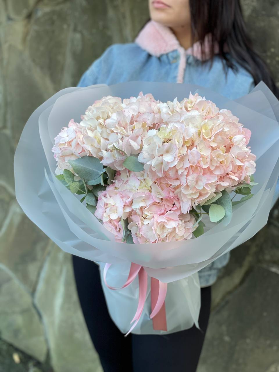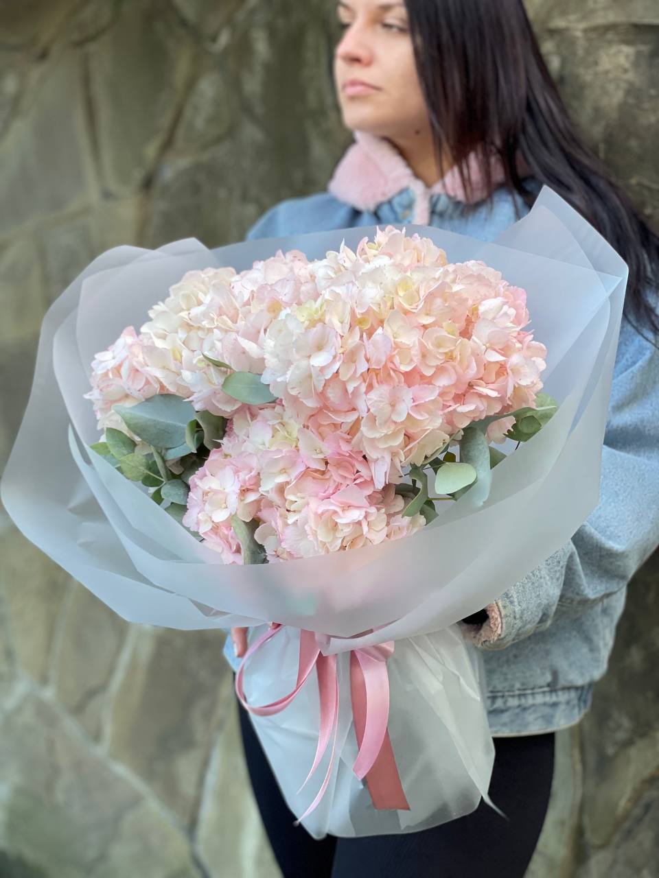 Белоснежные соцветия гортензии дополнены матовой зеленью эвкалипта, которая задаёт букету спокойный природный ритм. Композиция выглядит свободно и естественно, сохраняя графичность линий.