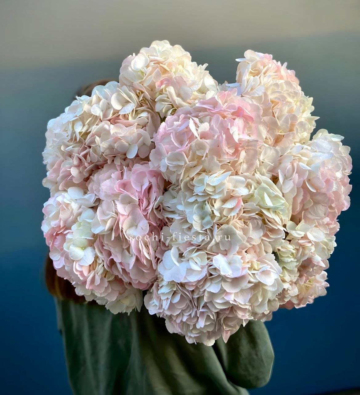 Девять пышных соцветий розовой гортензии собраны в объёмный букет с мягким градиентом оттенков. Каждая головка раскрыта полностью, создавая плотное облако лепестков.
