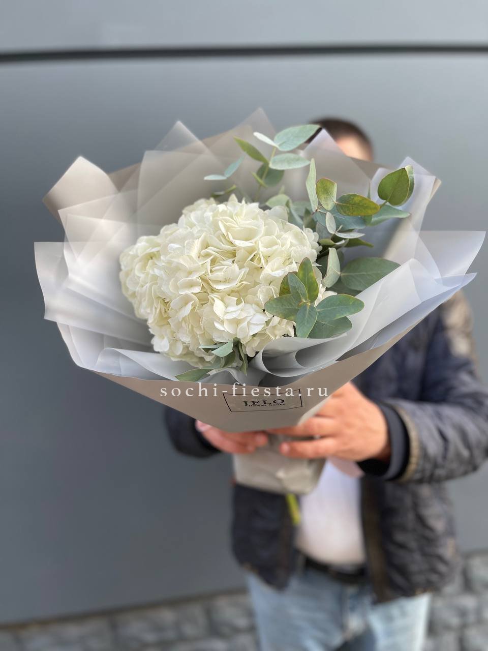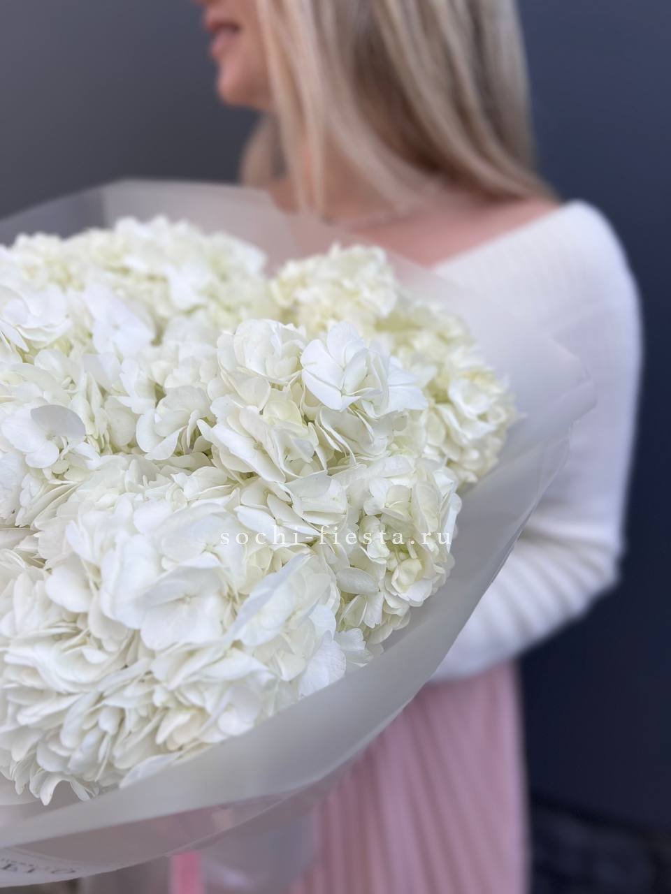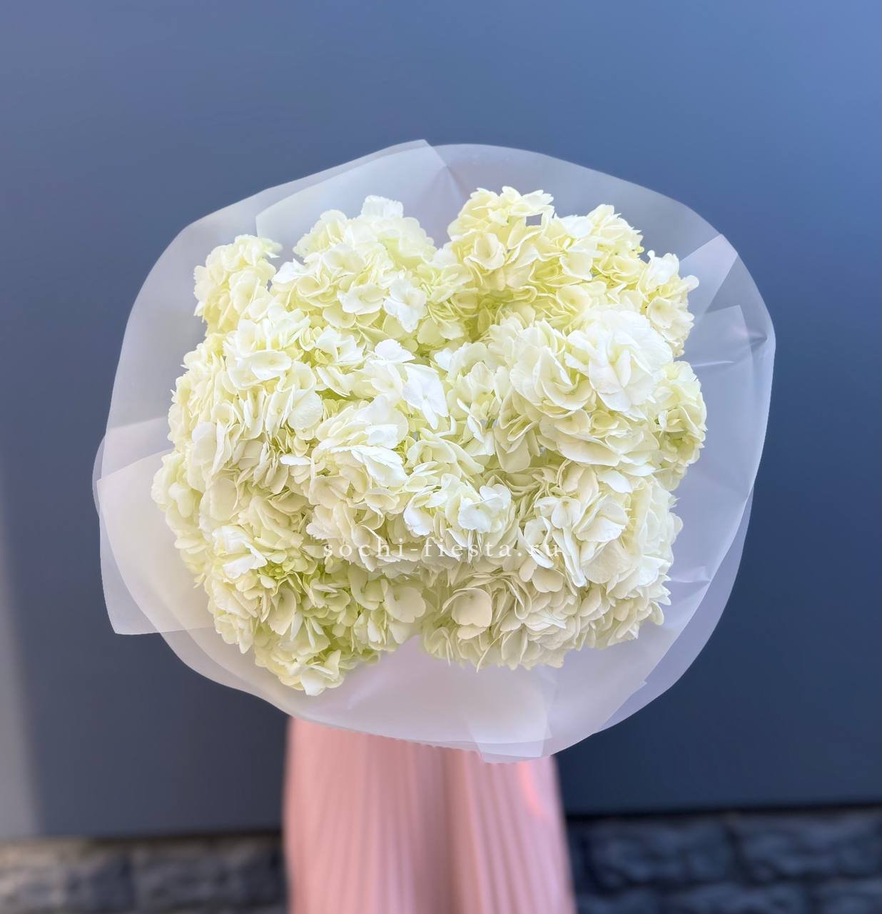 Белоснежное соцветие гортензии с плотной структурой и чистым тоном. Универсальный вариант для минималистичных интерьеров и спокойных решений.