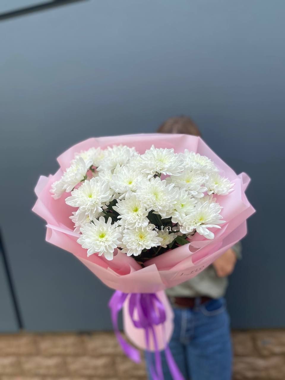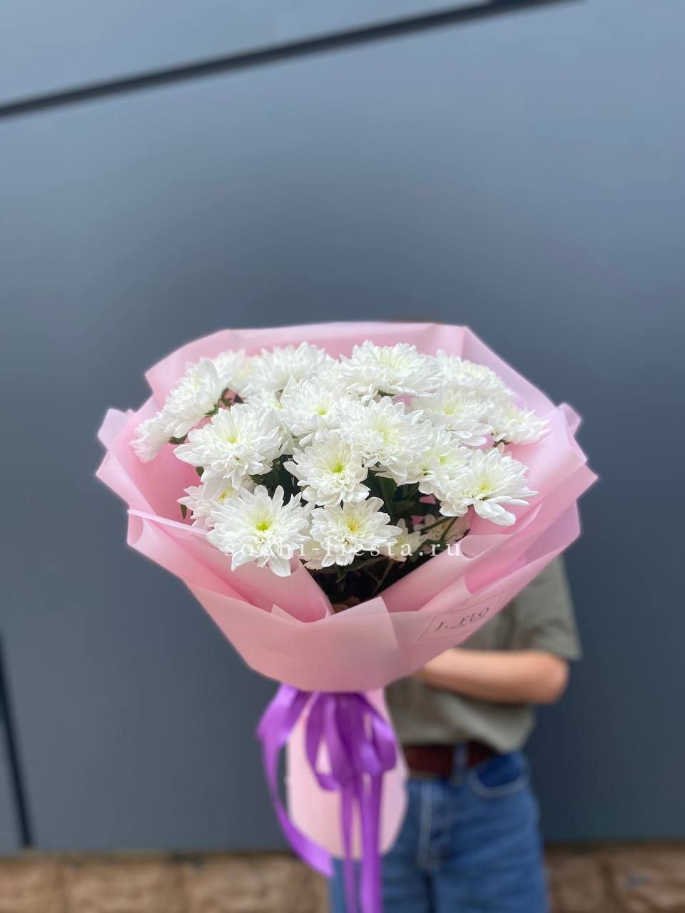 Семь веток кустовой хризантемы обрамлены лавандовым фоамираном, который мягко перекликается с оттенками бутонов. Композиция собрана свободно, сохраняя естественную пластику стеблей и живость форм.