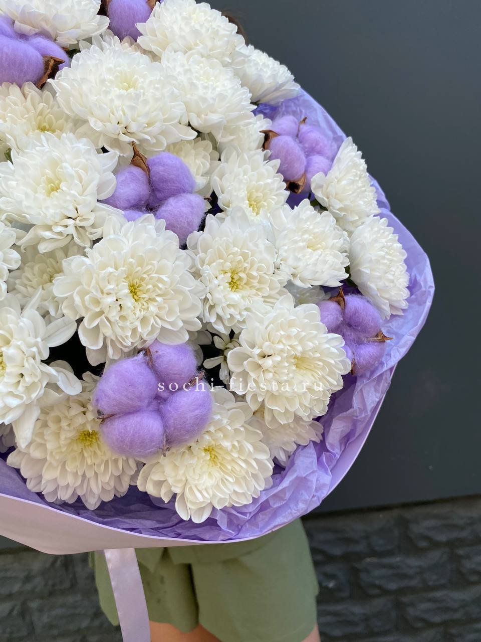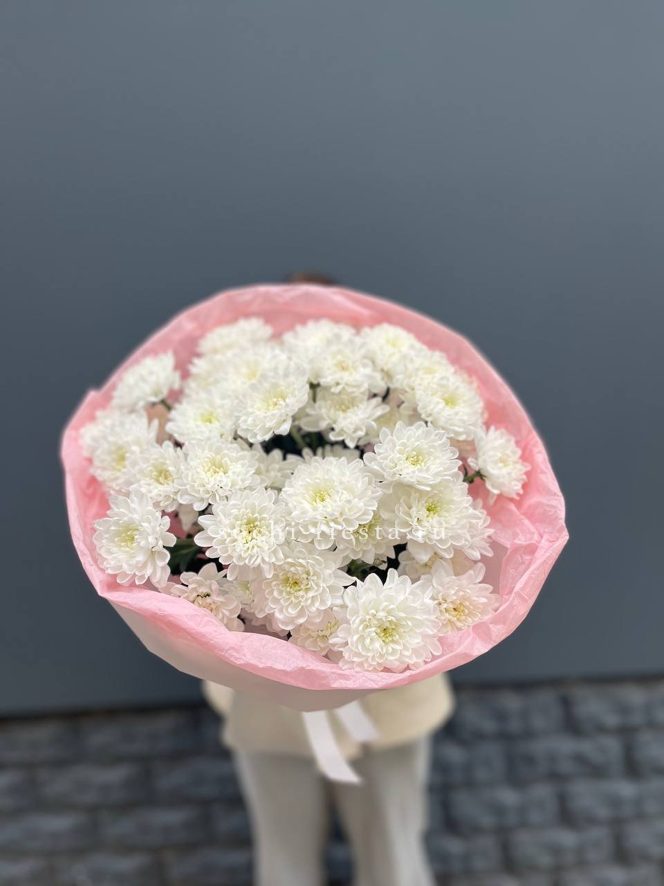 Fifteen веток кустовой хризантемы образуют пышное облако из множества мелких бутонов. Простая упаковка не отвлекает от густоты соцветий и их природной фактуры. Букет долго сохраняет свежесть и объём.