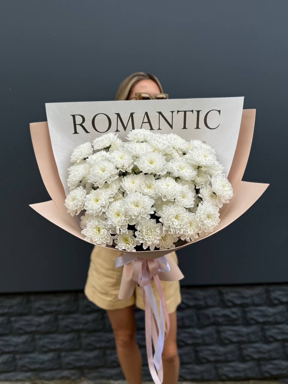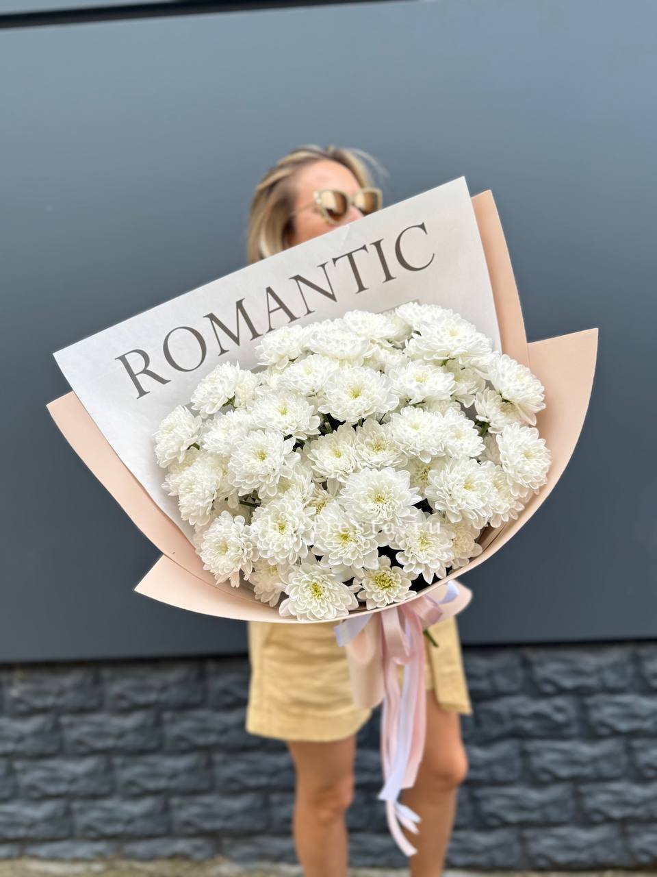 минимальный состав: 11 одноголовых хризантем, лента, упаковка на выбор.