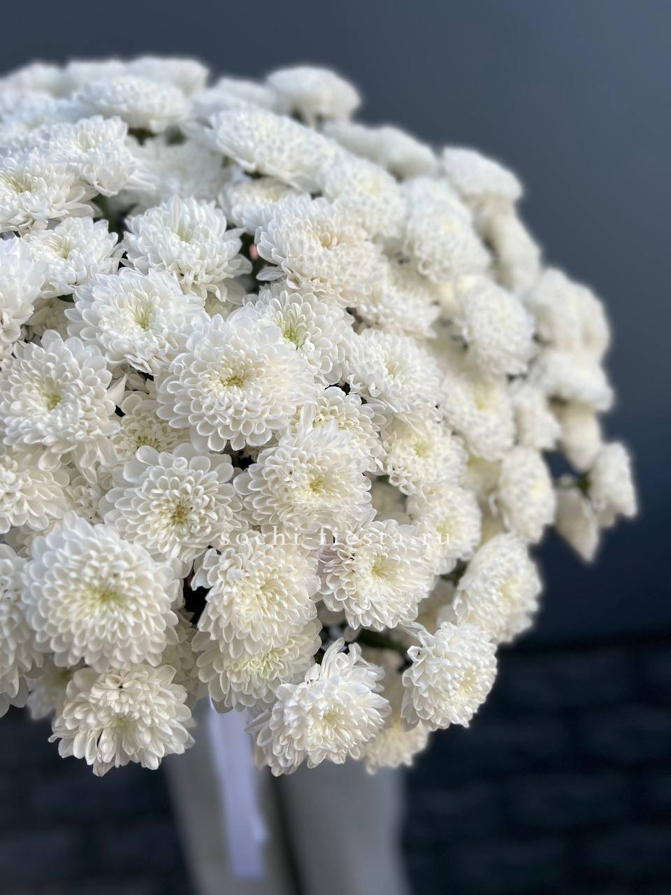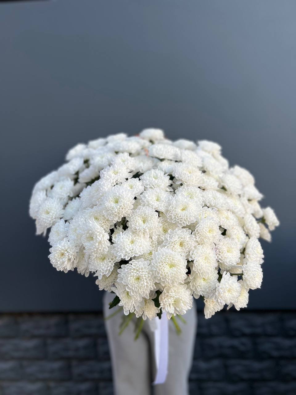 Пятнадцать веток кустовой хризантемы в натуральном крафте. Множество мелких соцветий формируют пышную шапку с естественной россыпью бутонов, подчёркнутую простотой оформления.