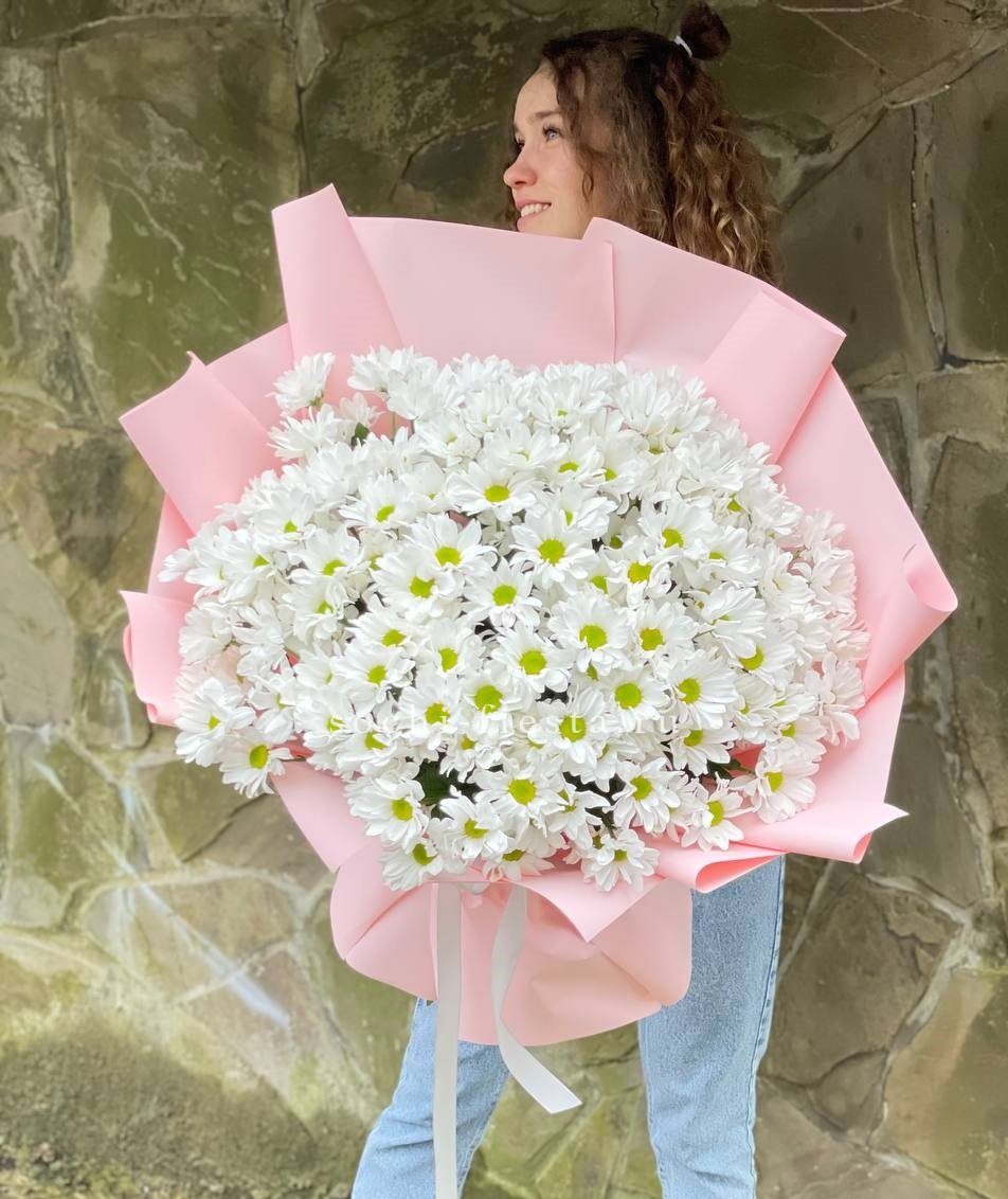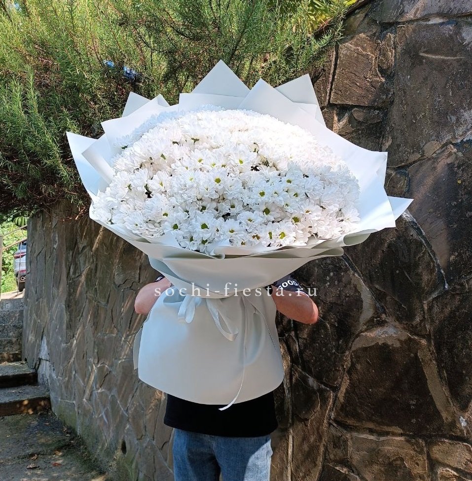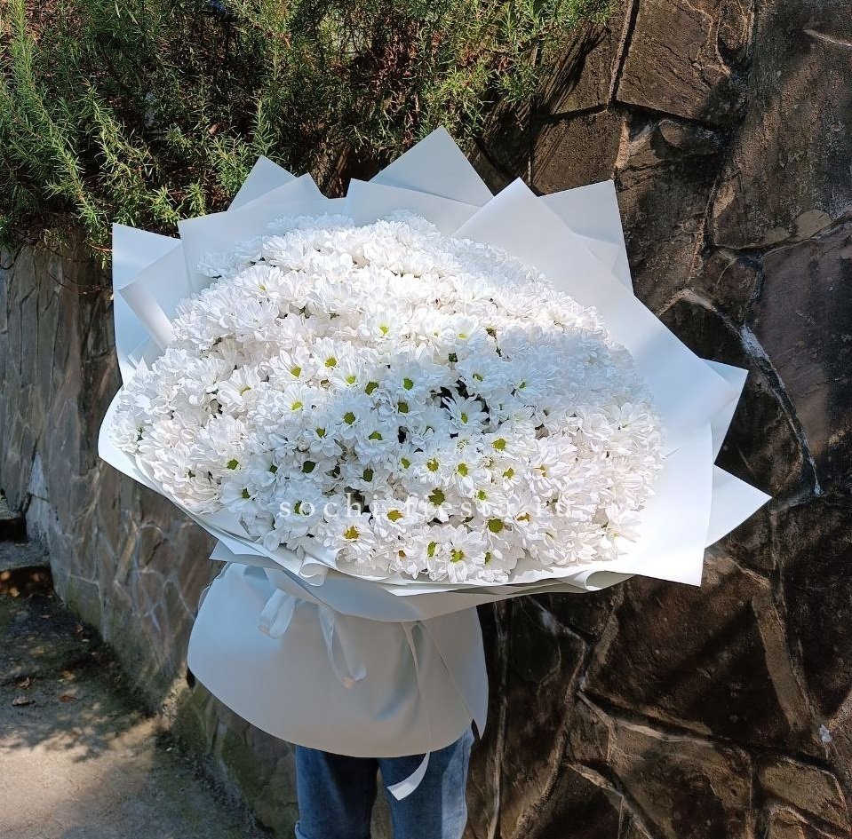 Сто одна хризантема формирует воздушное облако с мягким ритмом бутонов. Объемная композиция держит форму и наполняет пространство легким присутствием.