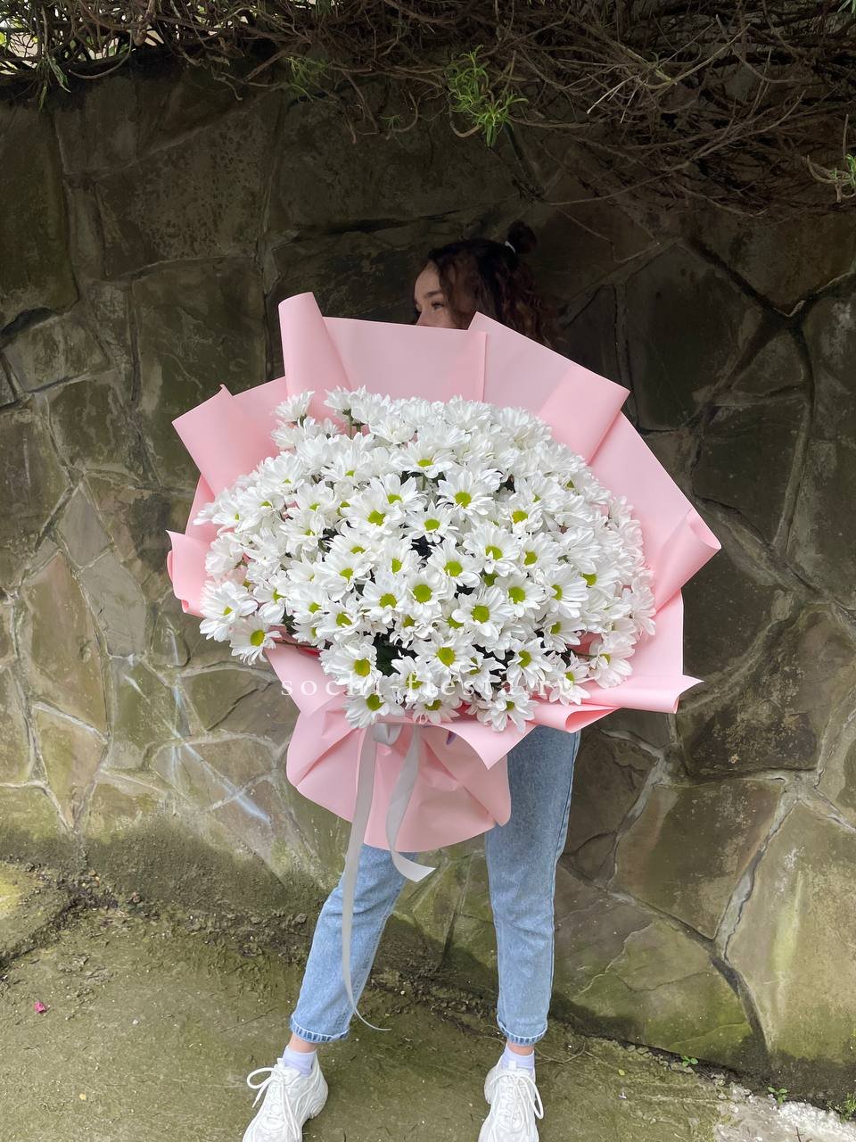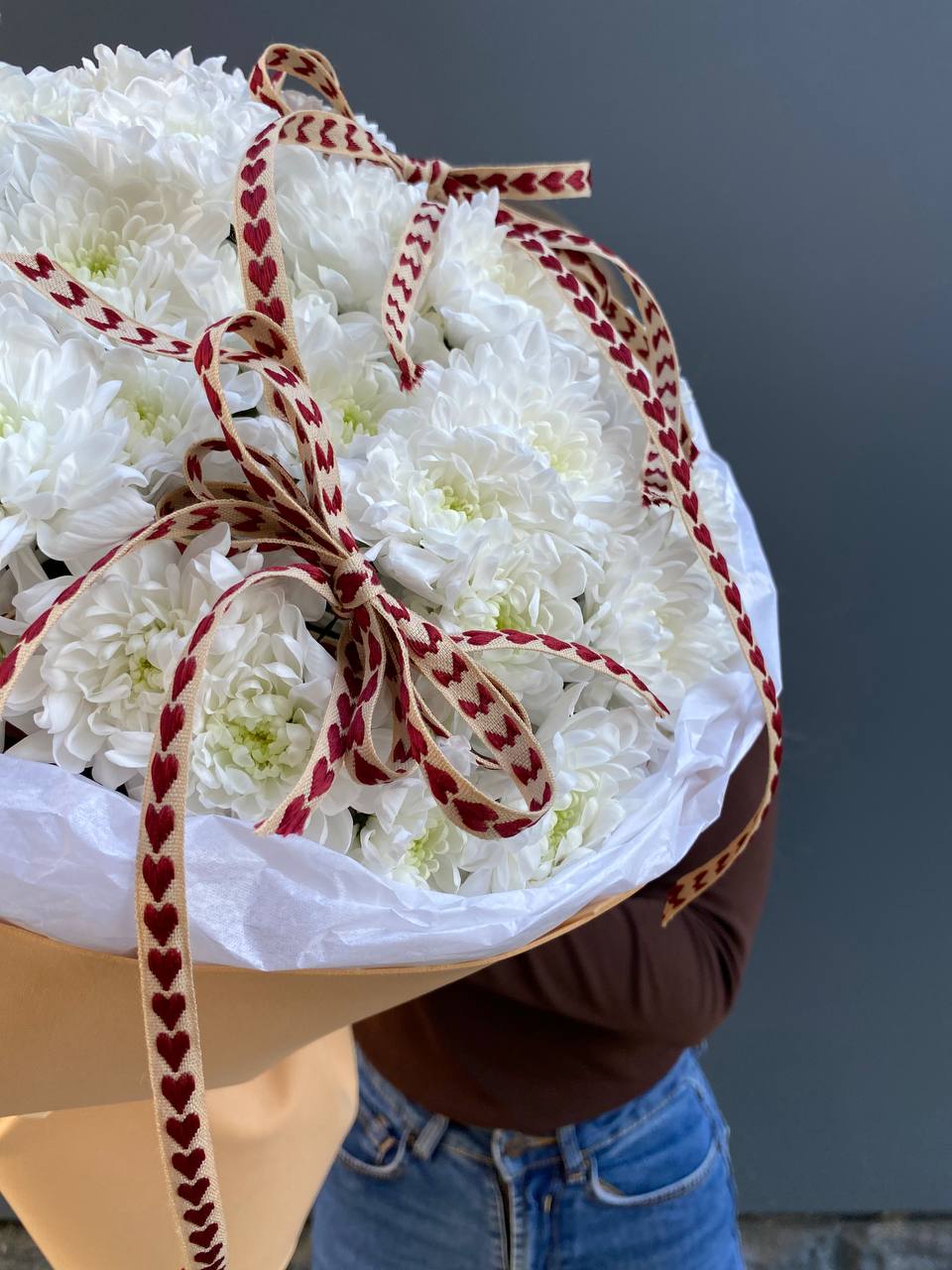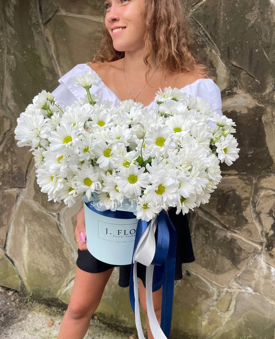 Сто одна хризантема формирует воздушное облако с мягким ритмом бутонов. Объемная композиция держит форму и наполняет пространство легким присутствием.