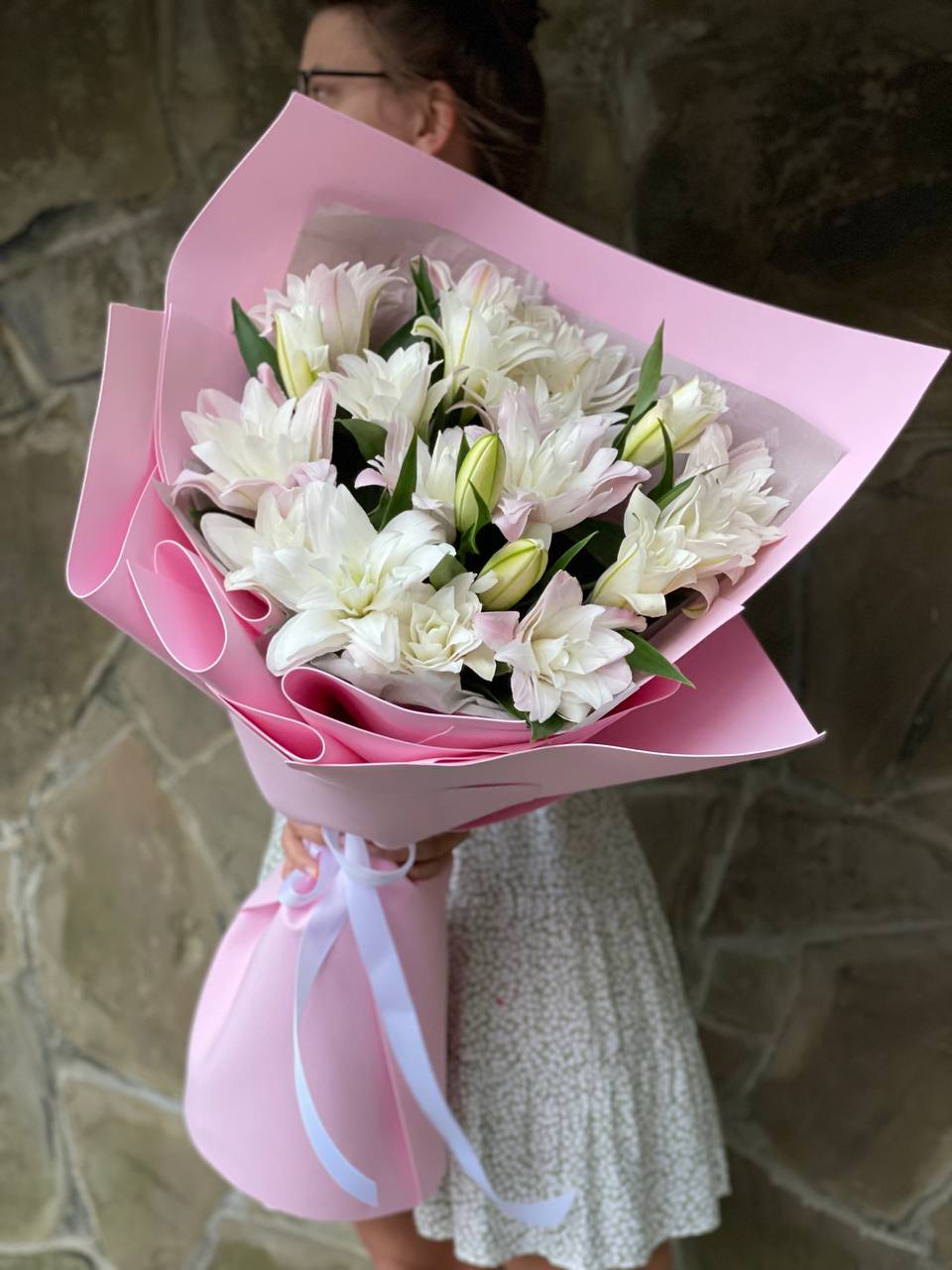 Девять махровых бутонов с плотно уложенными лепестками создают объёмную композицию. Пионовидные лилии раскрываются постепенно, удерживая форму несколько дней. Букет выглядит самодостаточно и занимает заметное место в интерьере.
