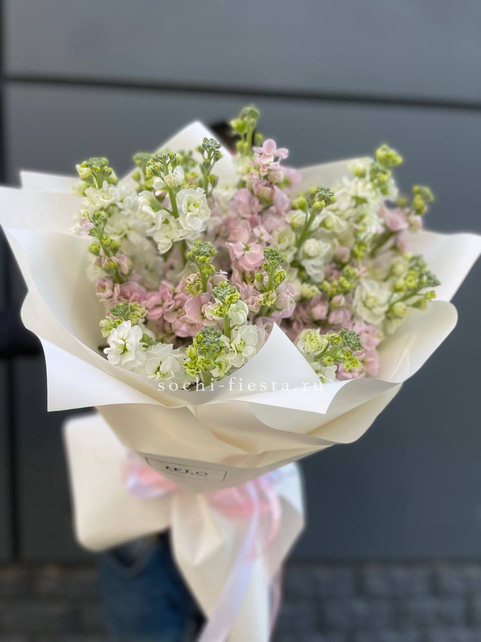 Двадцать девять веток маттиолы создают воздушное облако с насыщенным запахом и мягкими переходами оттенков. Лепестки раскрываются постепенно, меняя силуэт букета день за днём.