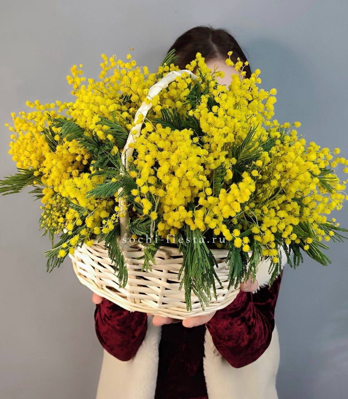 Двадцать веток мимозы собраны в корзине и перевязаны лентой. Яркие желтые шарики создают плотное облако цвета, которое наполняет пространство весенним настроением.