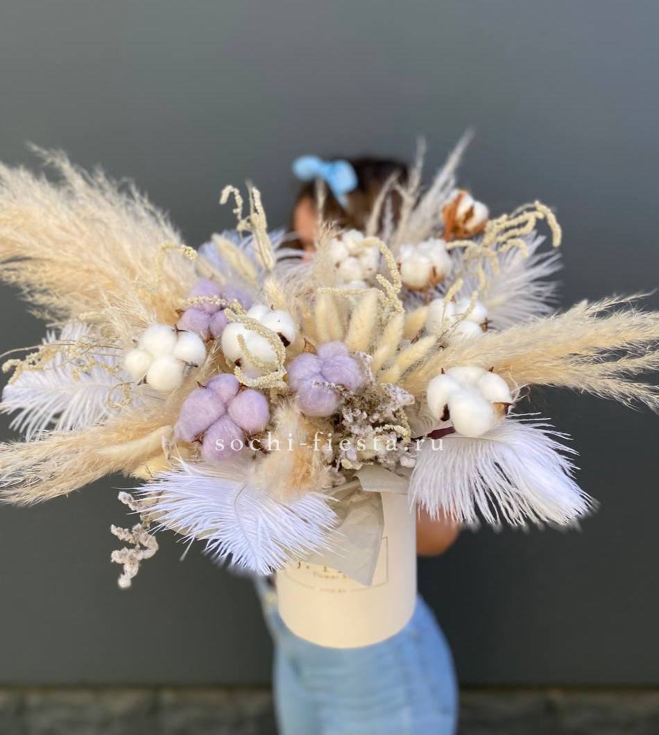 Бокс с природными текстурами: мягкость хлопка, воздушность лагуруса и графичность амаранта. Перья добавляют легкости. Композиция держит форму и не теряет выразительности со временем.