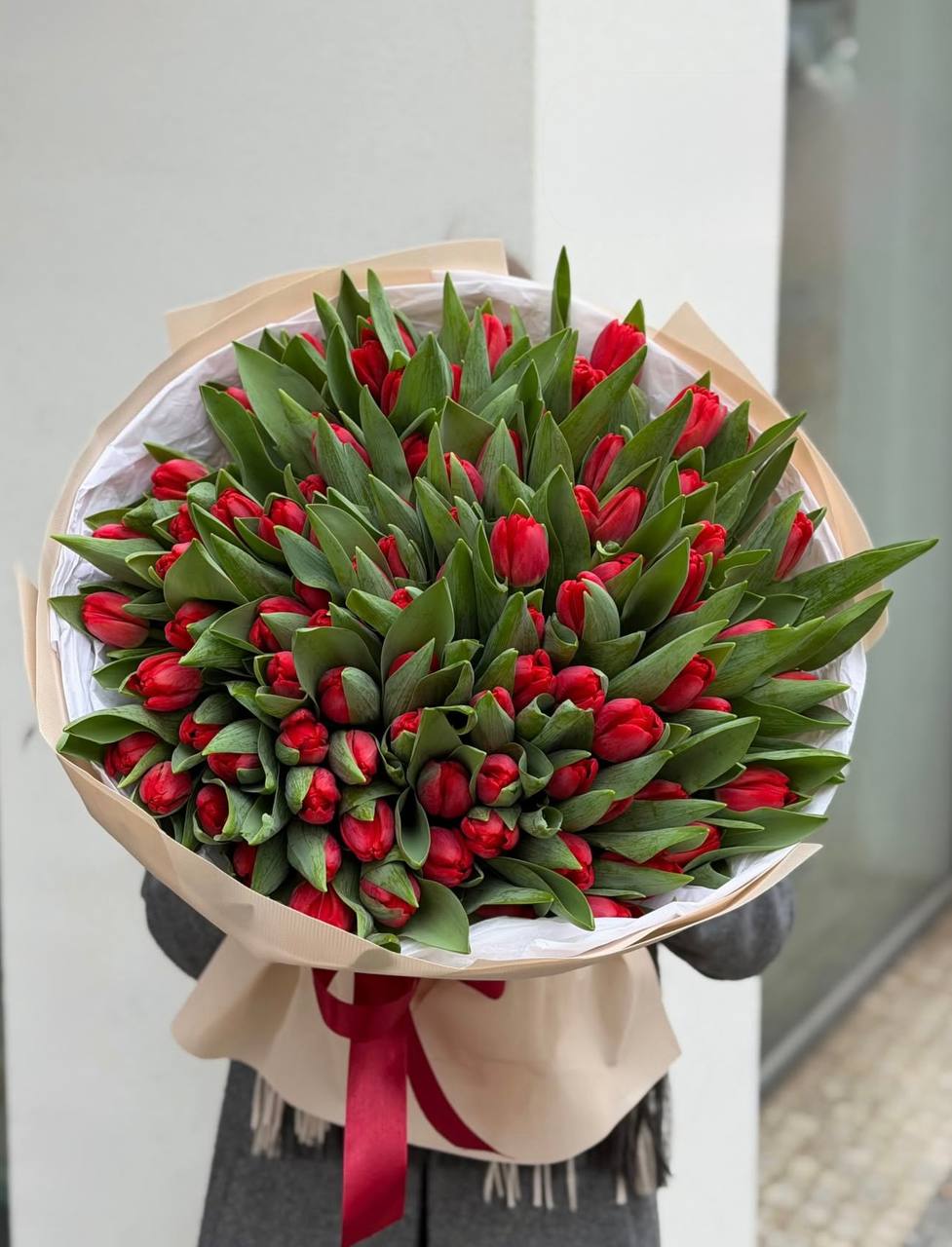 Сто один тюльпан в разных оттенках создают объемную цветовую волну. Плотная сборка и дизайнерская упаковка превращают букет в яркое визуальное событие. Это про масштаб и весеннюю энергию.