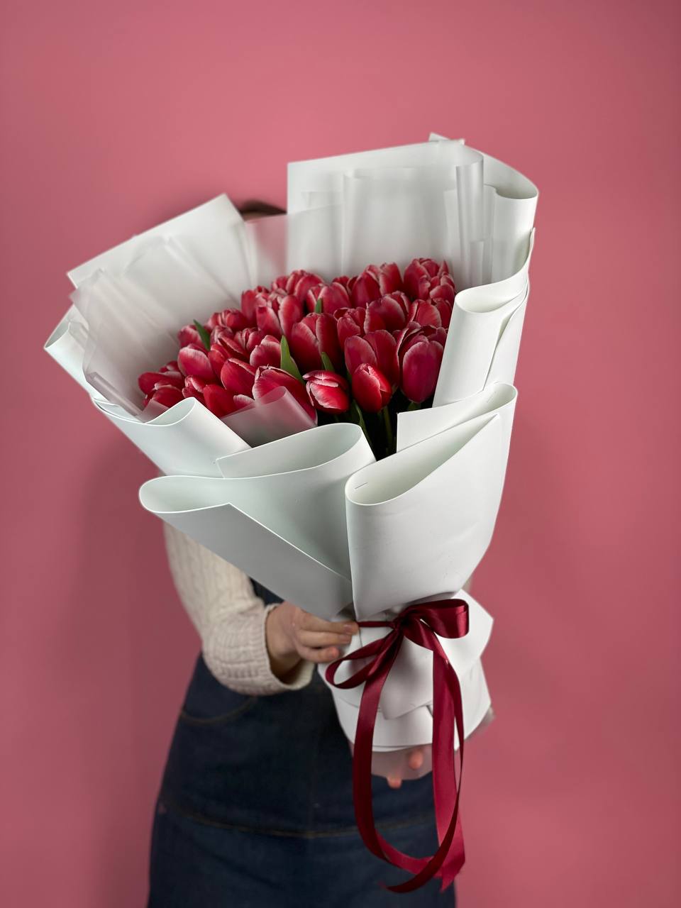 изначальная цена указана за букет из 15 тюльпанов Состав букета на фотографии: 35 тюльпанов, лента, упаковка.