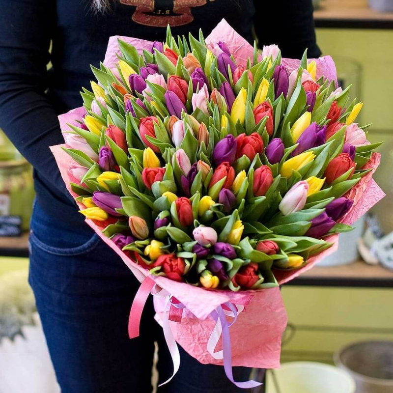 101 тюльпан разноцветных оттенков, лента, крафт или дизайнерская пленка.