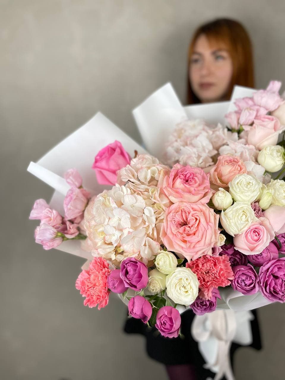 Плавные линии пышных соцветий гортензии переходят в округлые формы пионовидных роз и воздушные бутоны эустомы. Диантусы добавляют графичности, а дизайнерское оформление задает общий ритм композиции. Букет для пространств с характером.