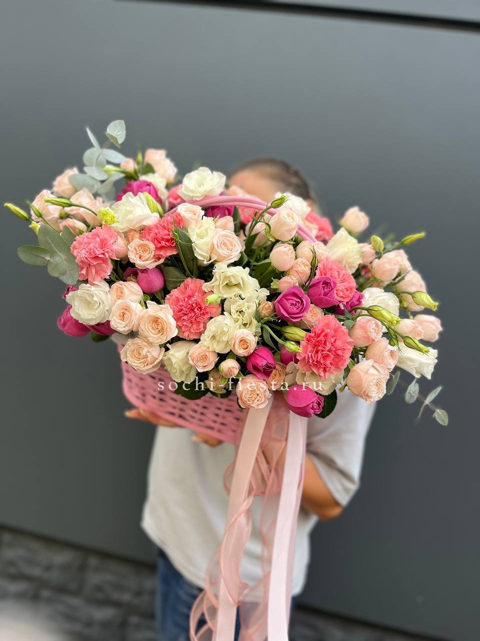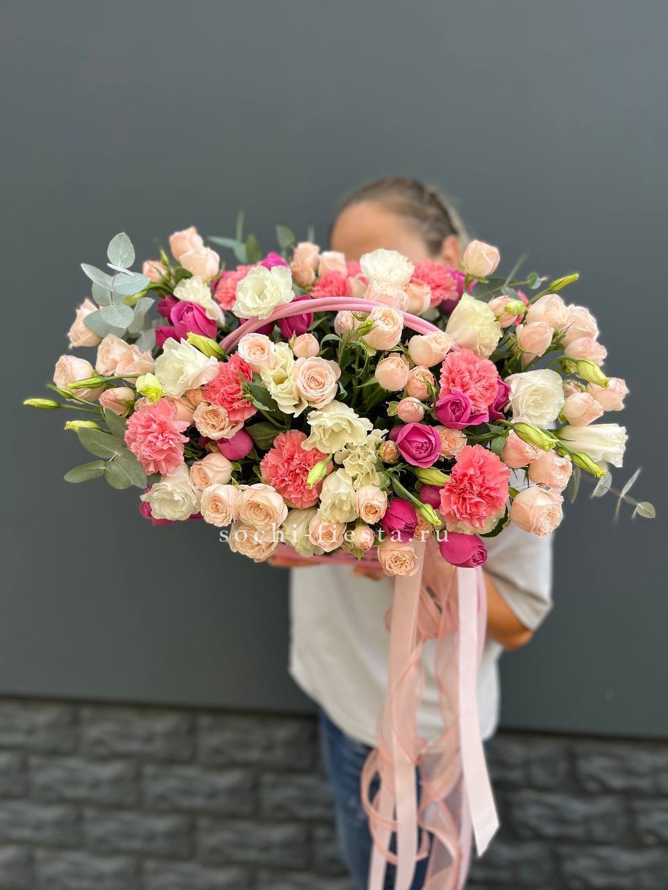 гортензия, белая роза, розовая роза, гербера, эустома, декоративная зелень, эвкалипт дизайнерское оформление, лента.