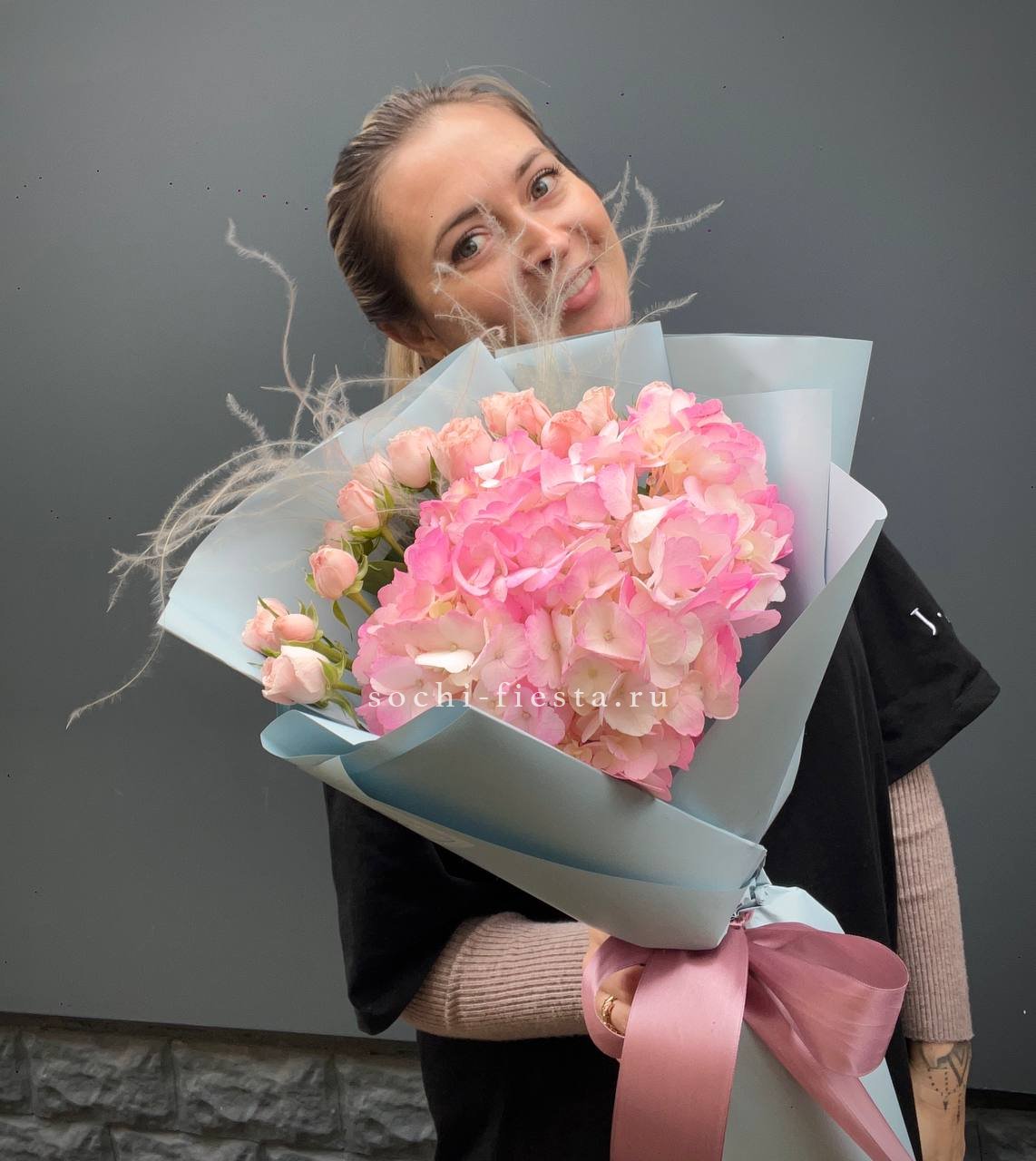Гортензия и кустовые розы соединяются с веточками эвкалипта и ваксфлауэра в свободной композиции. Разная плотность соцветий создаёт живой ритм и природную лёгкость.