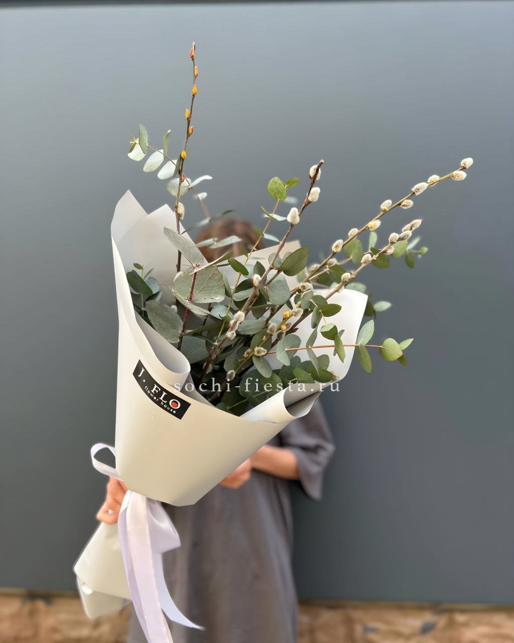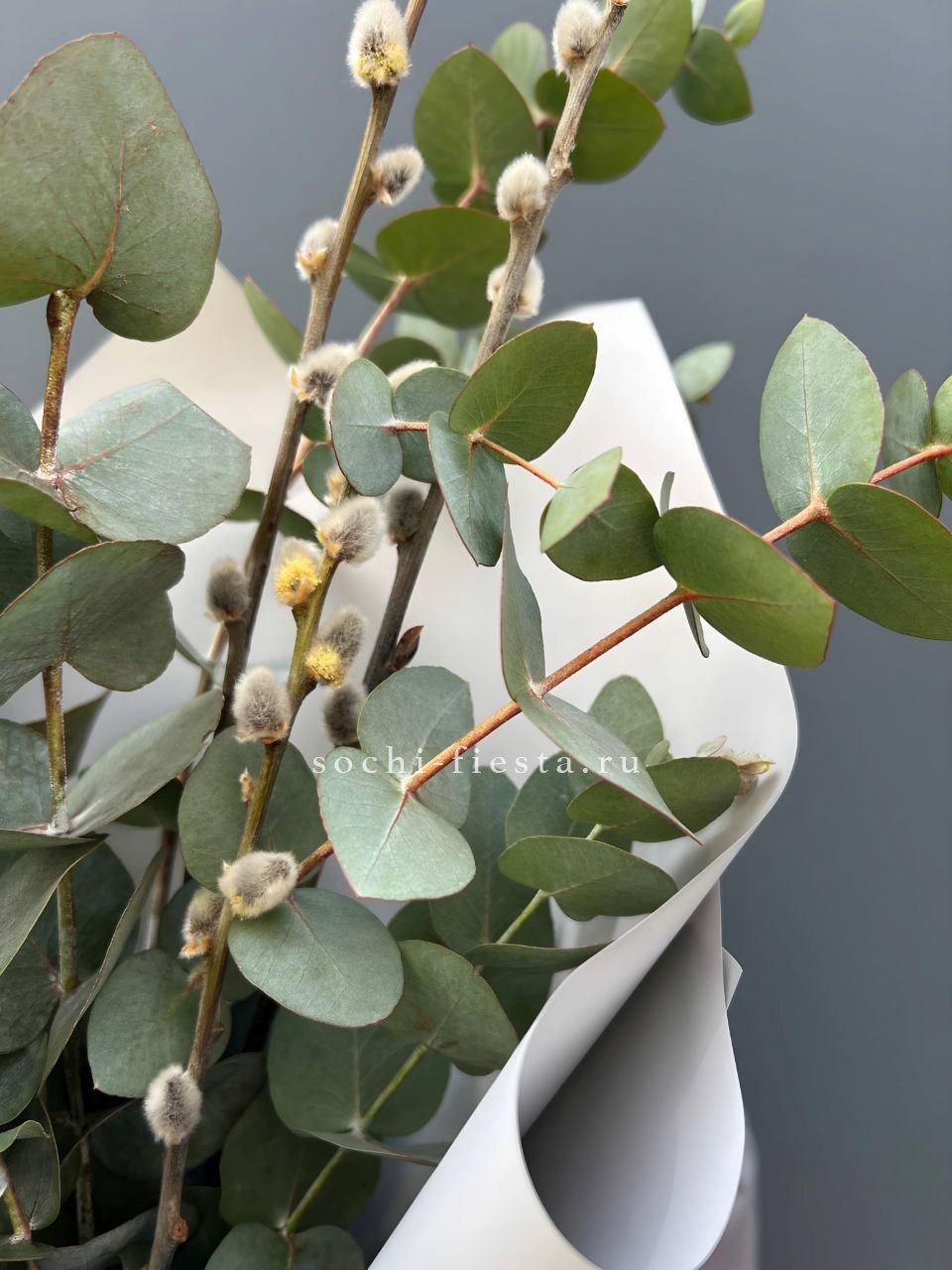 Пятнадцать вывернутых бутонов белого цвета раскрываются объемными шапками с волнистыми краями лепестков. Ветви эвкалипта добавляют букету воздушности и создают мягкую зеленую дымку вокруг цветов.