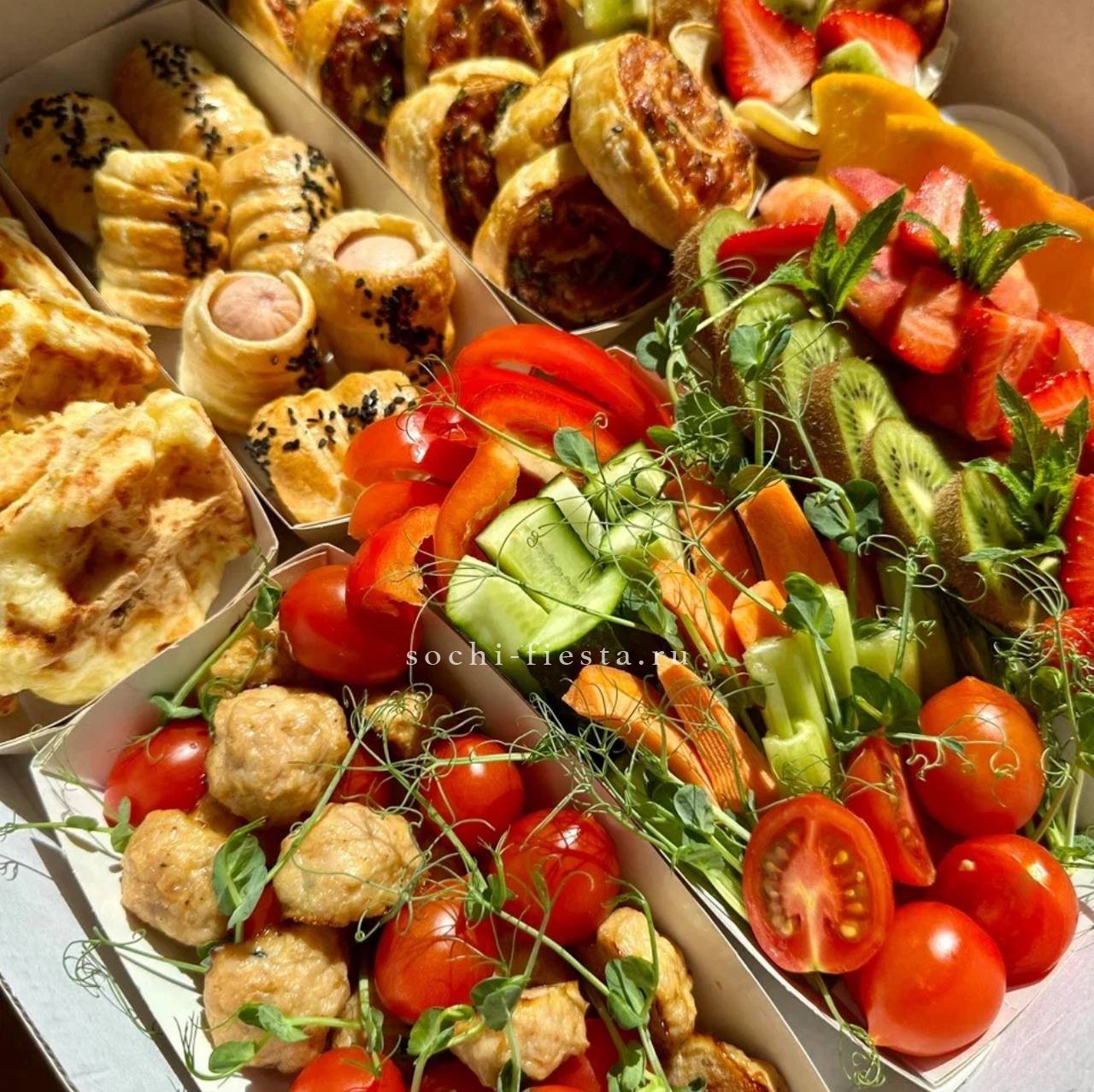 минибургер из свежевыпеченной булочки с кунжутом с куриной котлетой, сыром чеддер, соленым огурцом, свежим томатом, луком и салатом, заправка: авторский томатный соус- 14 шт. Картофельные шарики, подаются в стаканчиках- 4 стаканчика по 5 шт. Куриные нагетсы в кукурузной панировке, в стаканчиках- 4 стакана по 6 шт. Овощная корзинка. Фруктовая корзинка. Соусы красный и белый- 4 шт.