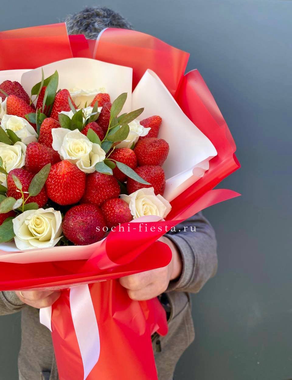 Кустовая роза окружает сочную клубнику, а эвкалипт добавляет свежести всей композиции. Букет упакован в дизайнерскую бумагу и перевязан лентой для аккуратной формы.