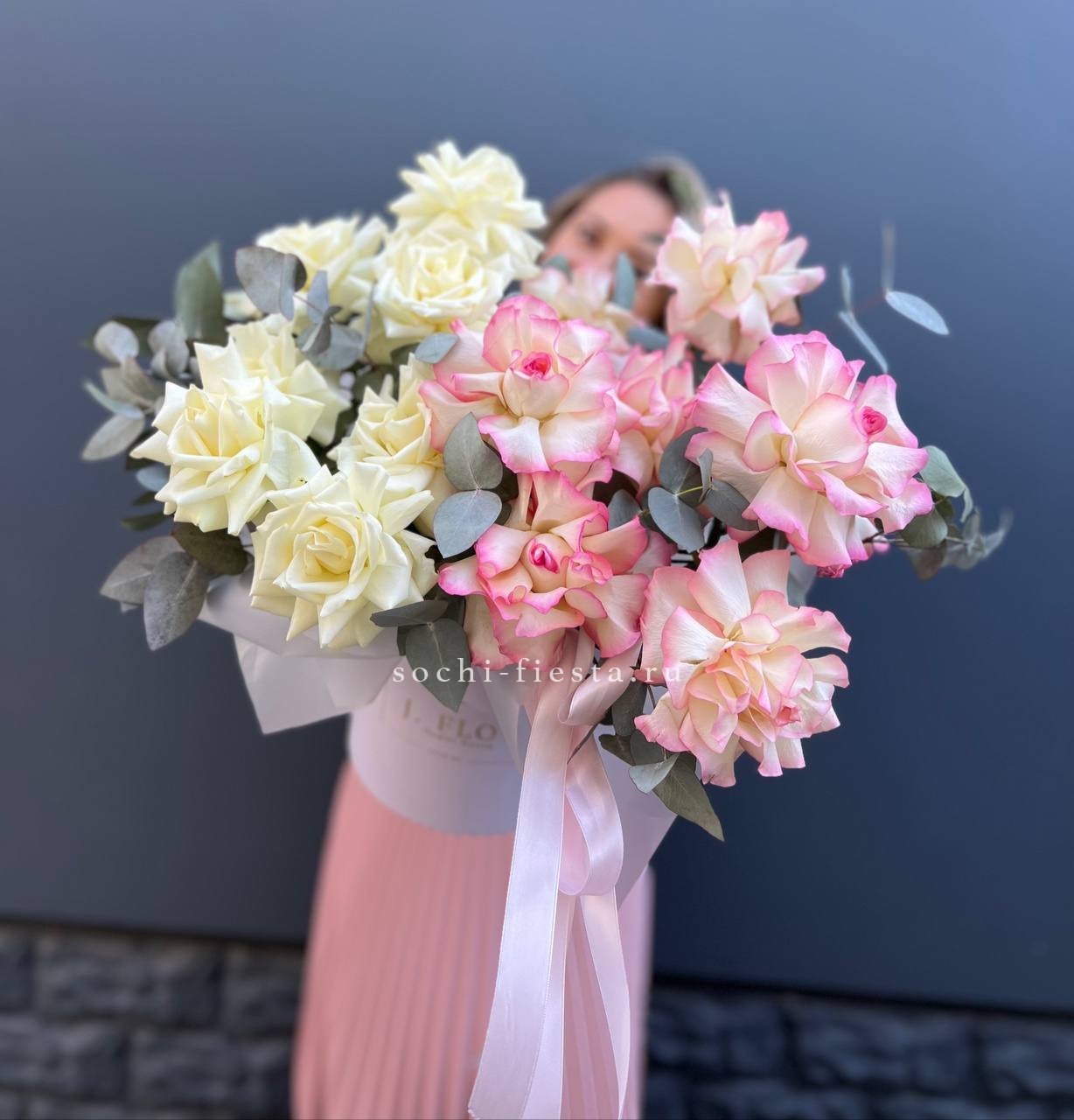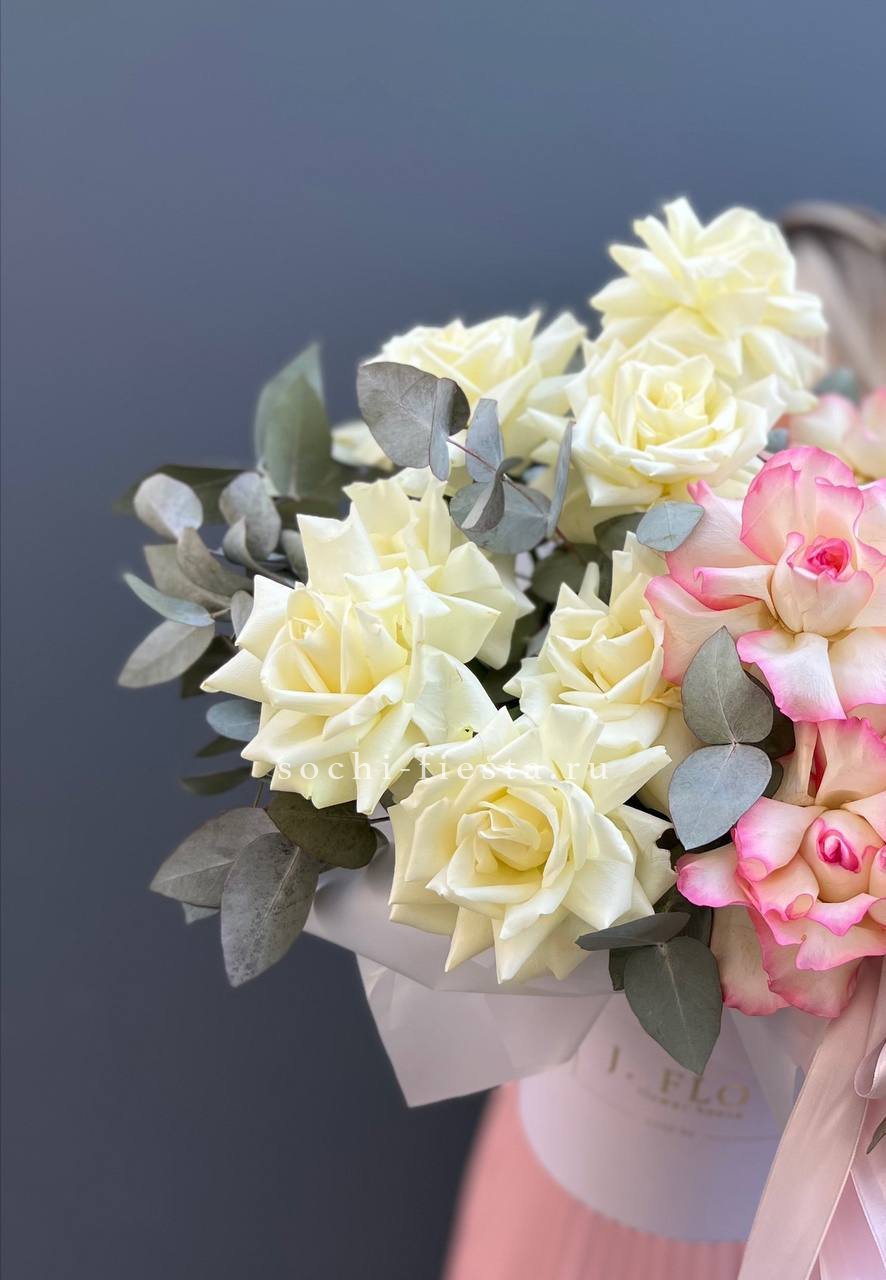 белые розы, эустома, цилиндр D13, эвкалипт, лента, упаковка.