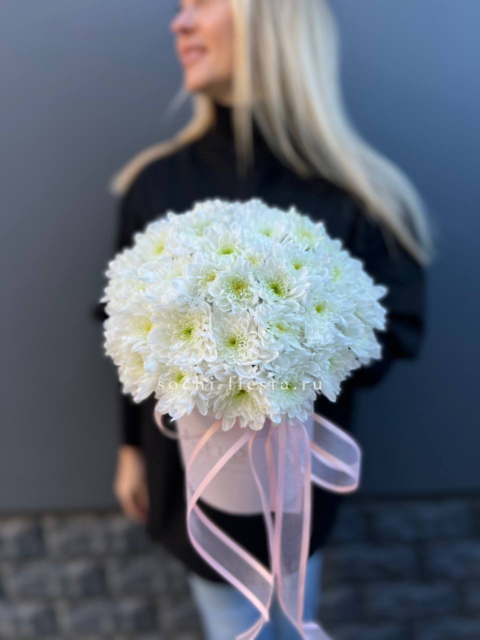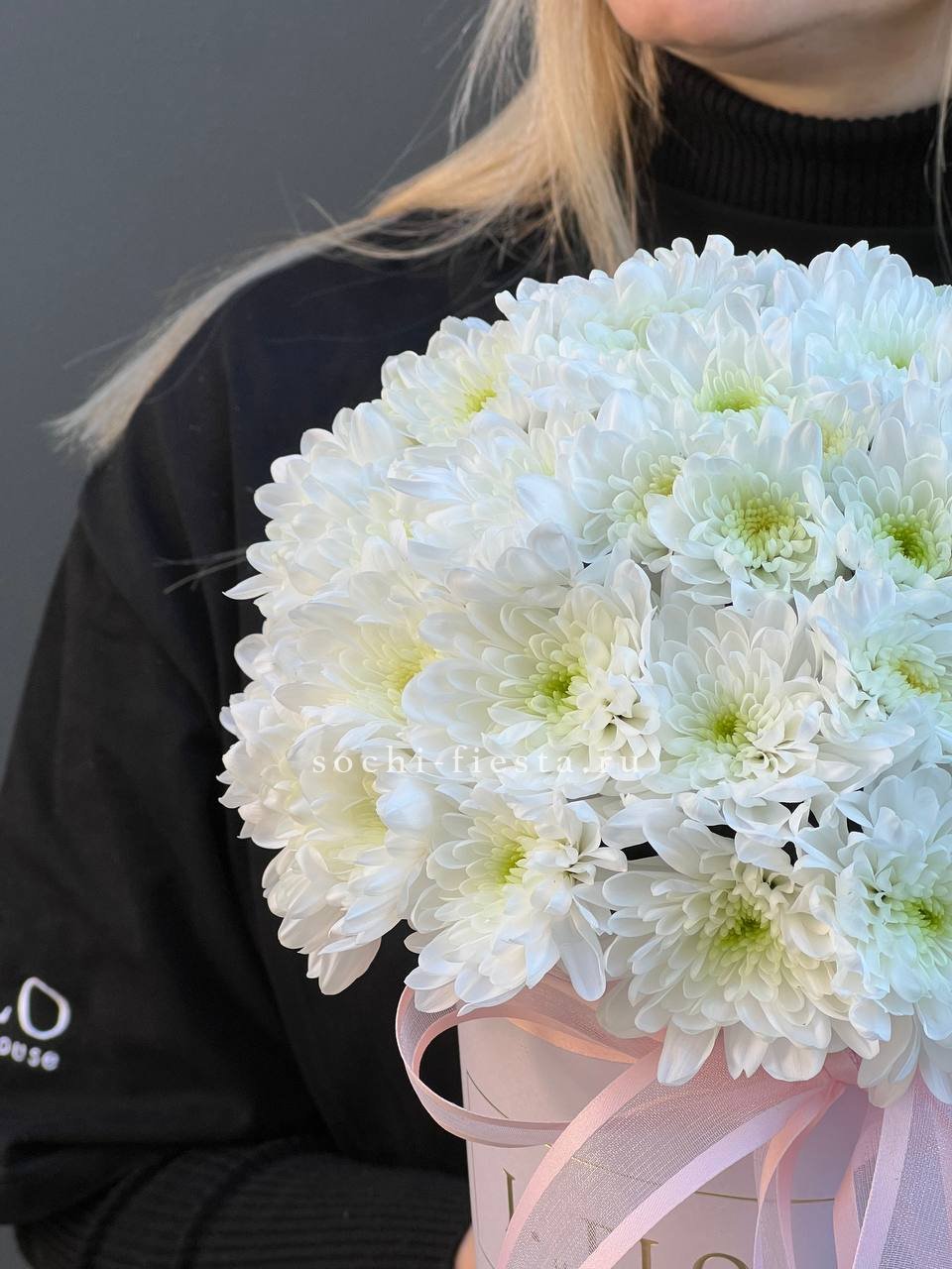 Хризантемы собраны в плотную округлую форму и помещены в аккуратный бокс. Компактное решение для рабочего стола или небольшой полки.