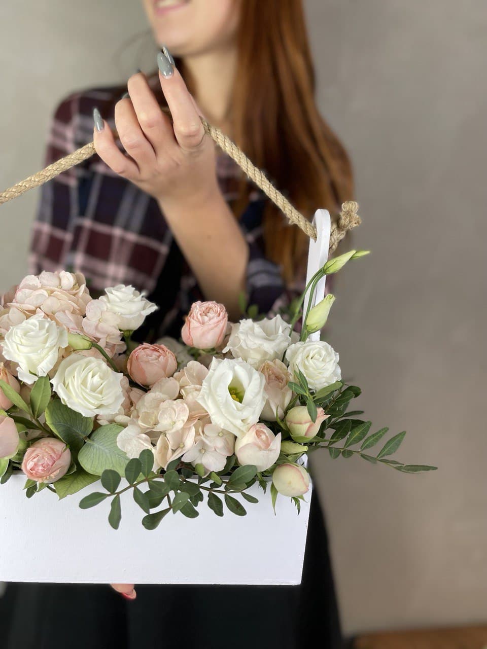 Деревянный ящик собрал в себе плотные бутоны кустовых роз, воздушную эустому и пышные соцветия гортензии. Зелень фисташки добавляет объём и завершает форму композиции.