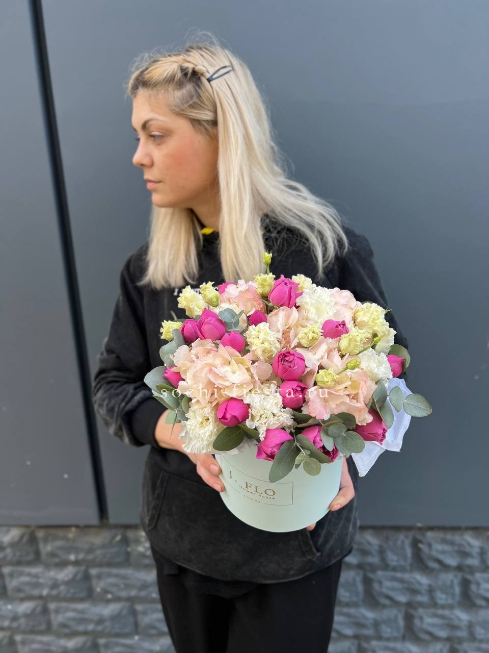 Французские розы раскрываются крупными бутонами рядом с воздушной эустомой и пушистой гортензией. Маттиола наполняет композицию тонким ароматом.