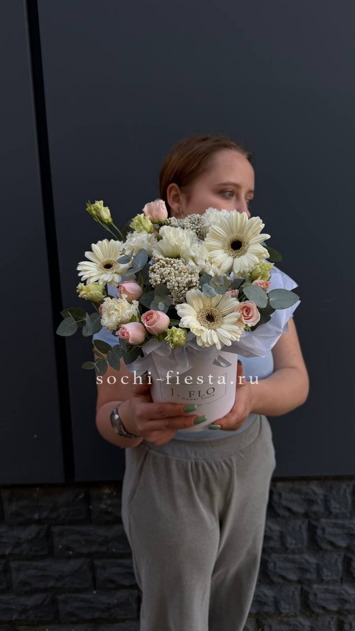 Белые розы и гортензия формируют объёмную основу, лилии вытягивают композицию вверх. Диантус и статица заполняют промежутки, создавая плотную текстуру в цилиндре.