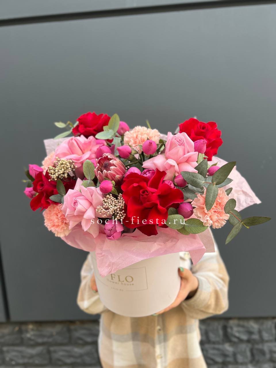 композиция из роз, протеи, диантусов, мисти баблс, озотамуса с эвкалиптом.