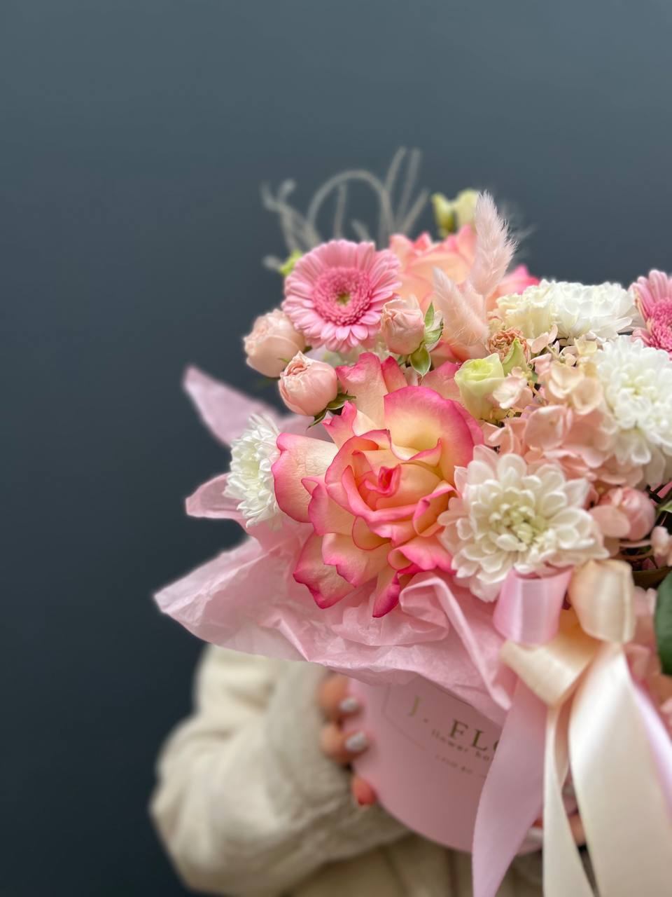 Композиция в коробке объединяет пышную гортензию, воздушную эустому и кустовые розы, Джумилию с яркими гербами и хлопком. Плотное заполнение создает округлую форму, где каждый цветок находит свое место без пустот.