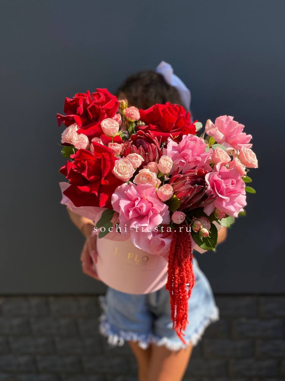 Букет выполнен в насыщенной красно-розовой гамме, создавая контрастное и выразительное сочетание, которое может символизировать сильные чувства или страсть. Это современный авторский букет, который выглядит роскошно и эффектно, подходящий для особых случаев и подарков.