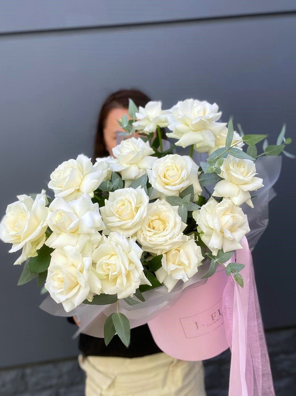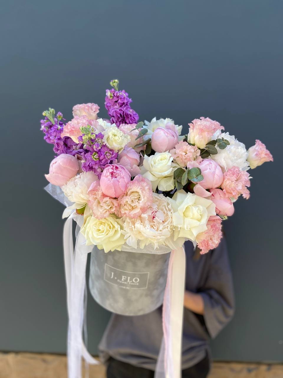 пионы, одноголовые розы, эустома, маттиола (аналог вне сезона), эвкалипт, лента, цилиндр D20.