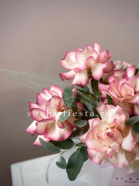 вывернутые  розы  Джумилия, цилиндр D16, эвкалипт, лента, упаковка.