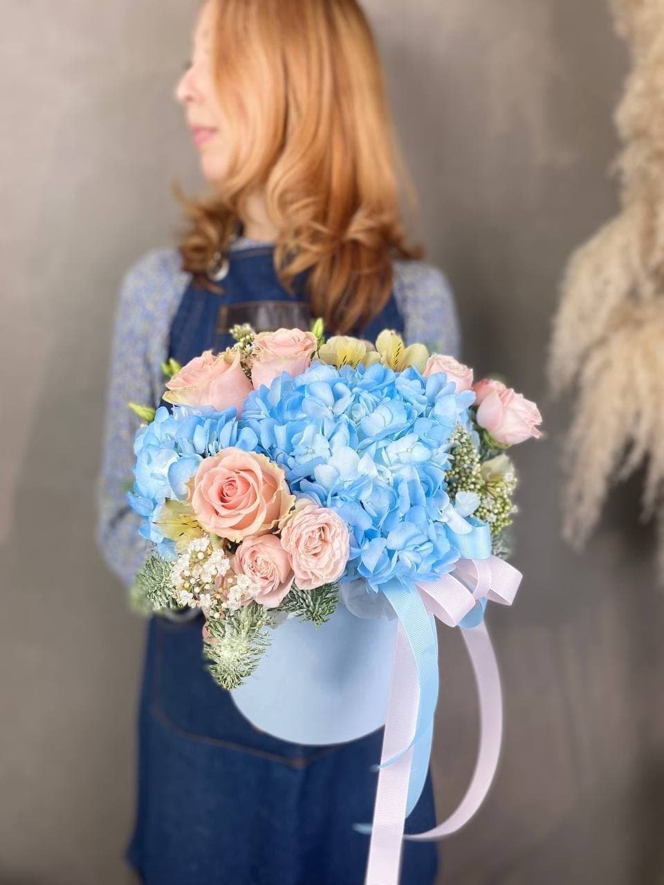 Гортензия и пионовидные розы создают плотную текстуру с мягкими переходами между крупными соцветиями. Озотамнус добавляет воздушности, а сезонный цветок вносит свежий акцент в общую композицию.