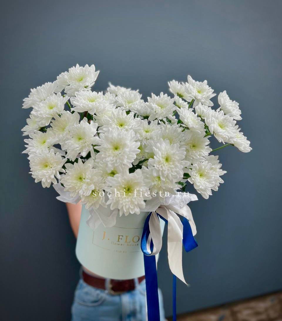 Пышные шапки кустовых хризантем раскрываются слой за слоем, создавая объемную текстуру. Композиция в цилиндре выглядит цельно и наполненно, лепестки плотно прилегают друг к другу.